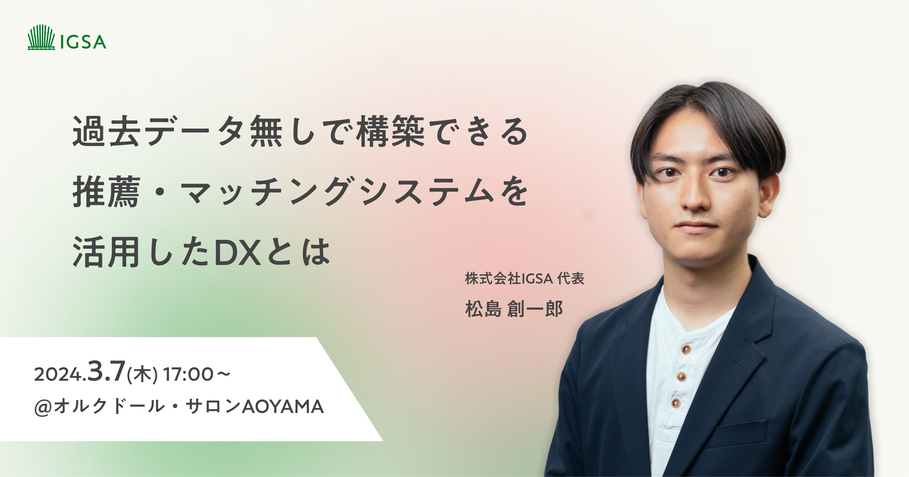 株式会社IGSA(本社:東京都文教区、代表:松島創一郎)は、2024年3月7日(木)にオルクドール・サロンAOYAMAにて「過去データ無しで構築できる推薦・マッチングシステムを活用したDXとは」を開催いたします。推薦システムを導入したいがデータが手元にない・用意するのが大変だと感じている経営者、役員及びDX推進担当者の方々必見のセミナーとなっております。参加費無料で、定員は20名とさせていただきます。