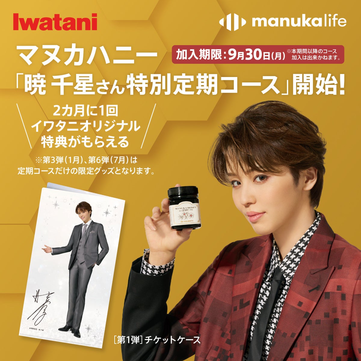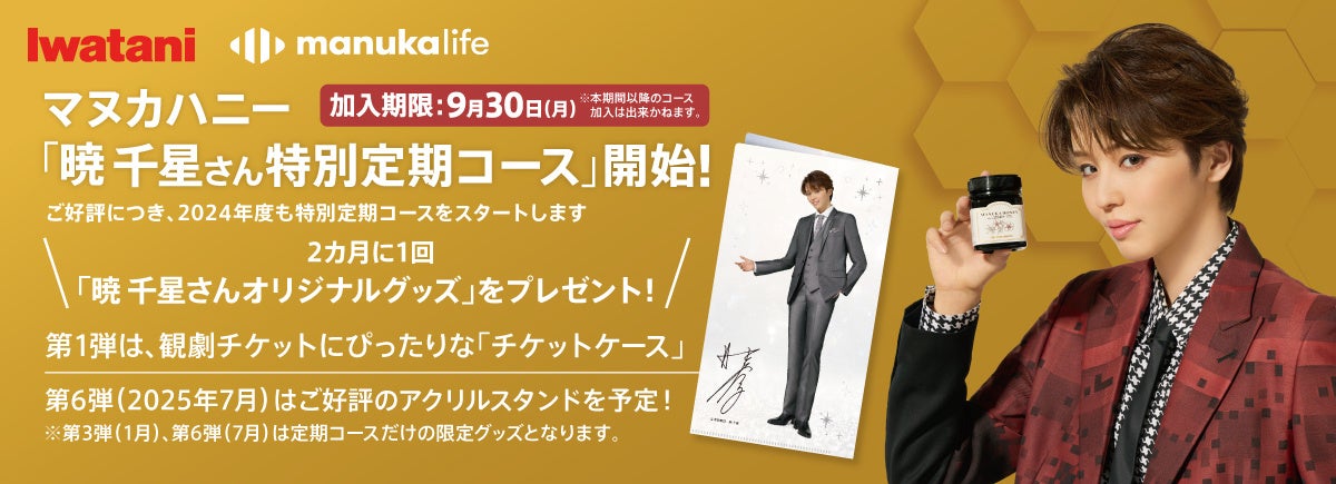 イワタニアイコレクト株式会社(大阪市中央区)は2024年9月4日(水)15時から2024年9月30日(月)の期間で、公式オンラインショップ「イワタニアイコレクト」もしくは「楽天市場イワタニアイコレクト公式ショップ」でマヌカハニーご購入の方を対象に、 “宝塚歌劇団 星組 暁千星さんオリジナルグッズ”がもらえるプレゼントキャンペーンを開催いたします。