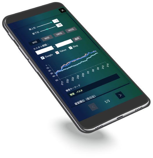BringRitera(リテラ)は、デバイスは「モバイル」「PC」、検索エンジンは「Google」「Yahoo!」「Bing」それぞれの組み合わせにおける検索順位について、毎日自動計測することが可能となりました。検索順位の推移はグラフで示されます。