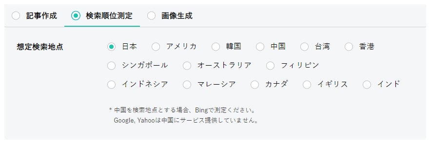 検索順位は検索地点によっても異なります。BringRiteraは日本語以外に英語、韓国語、中国語(簡体字)、台湾語(繁体字)、香港語(繁体字)での記事生成が可能となっており、それに合わせた検索地点の設定も可能としています。