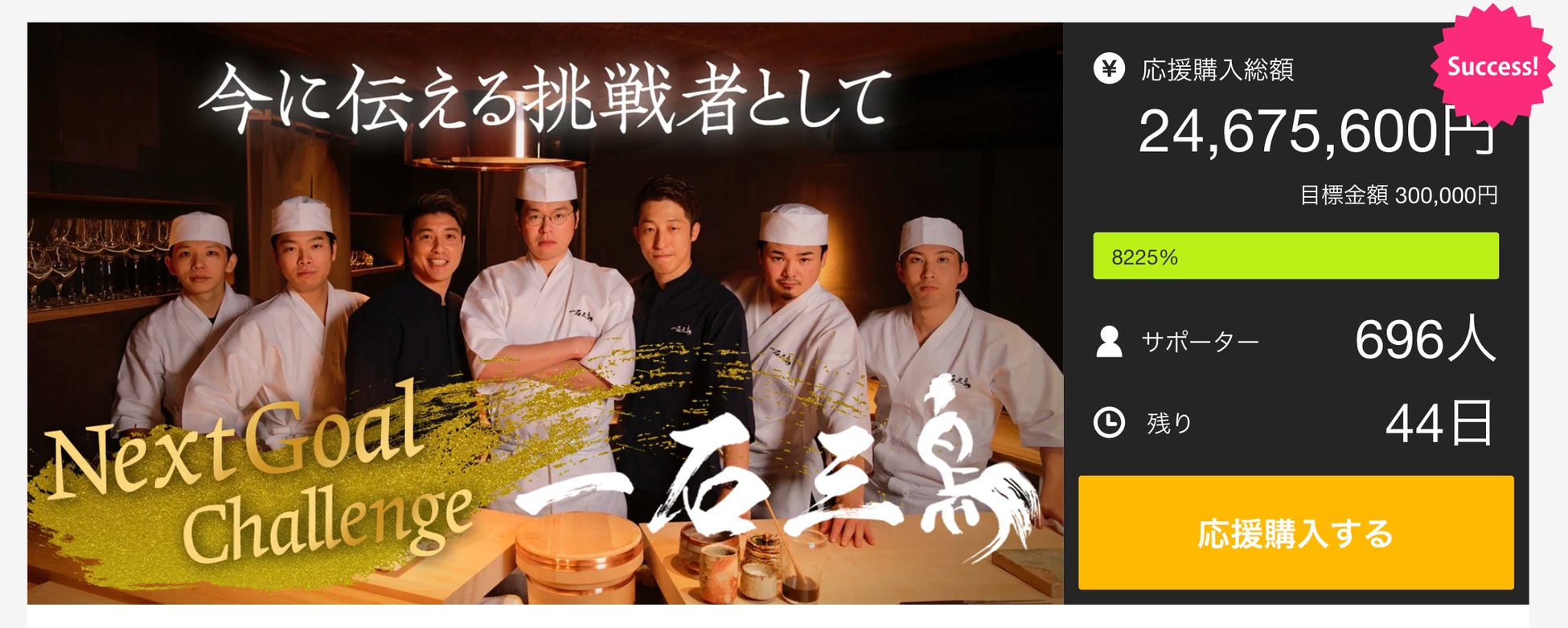 「鮨処 一石三鳥」クラファン開始後2週間で約2400万円の応援購入を達成、着地見込み5000万円