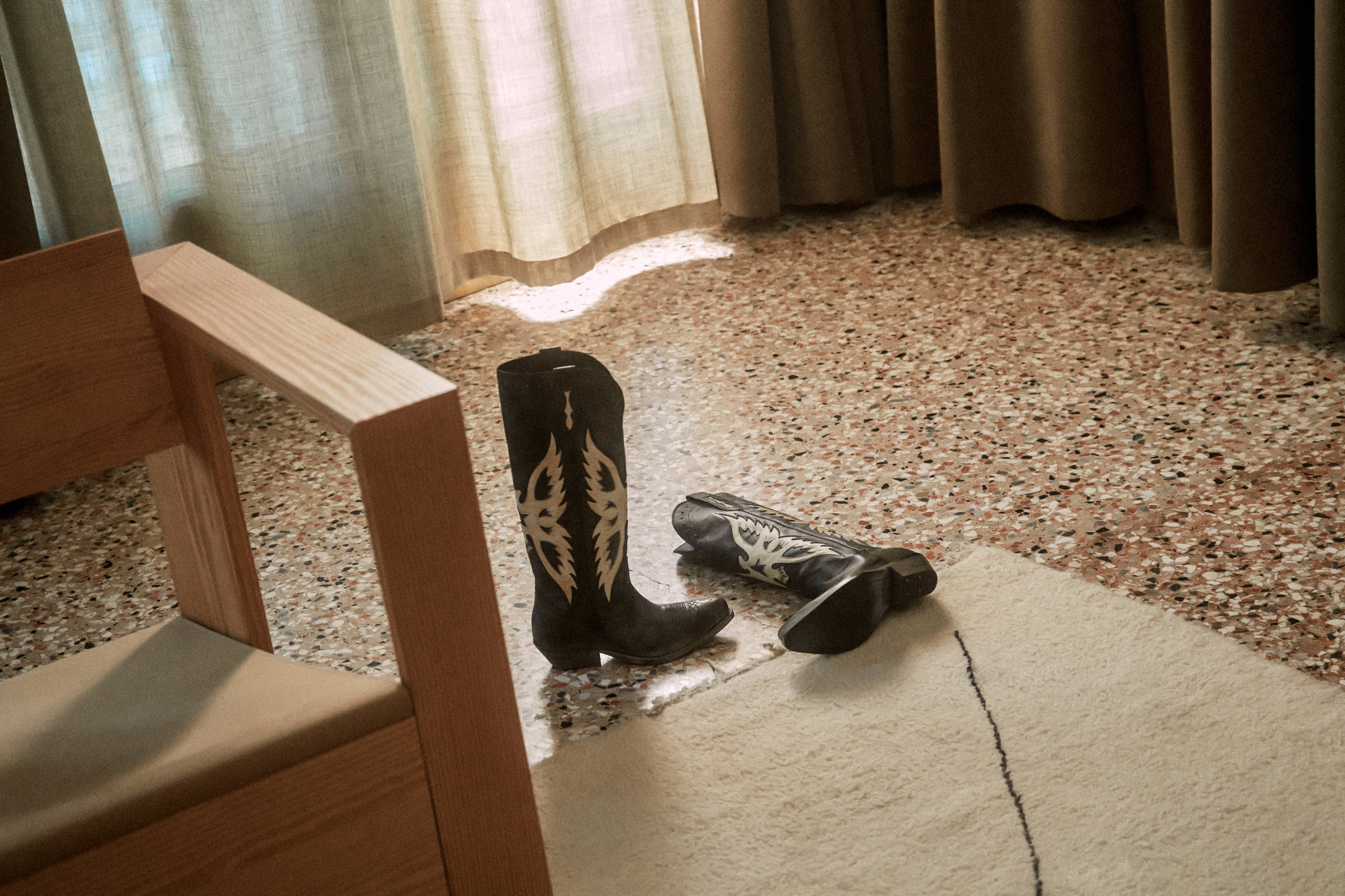 そして3つ目のアイテムは、アイコニックな Wish Star ニーハイブーツです。鷲のインターシャモチーフが施された、レザーのアート作品とも言えるこのブーツは、スキとゴールデングースがともに重要なインスピレーションの源としているウエスタン カルチャーにオマージュを捧げています。