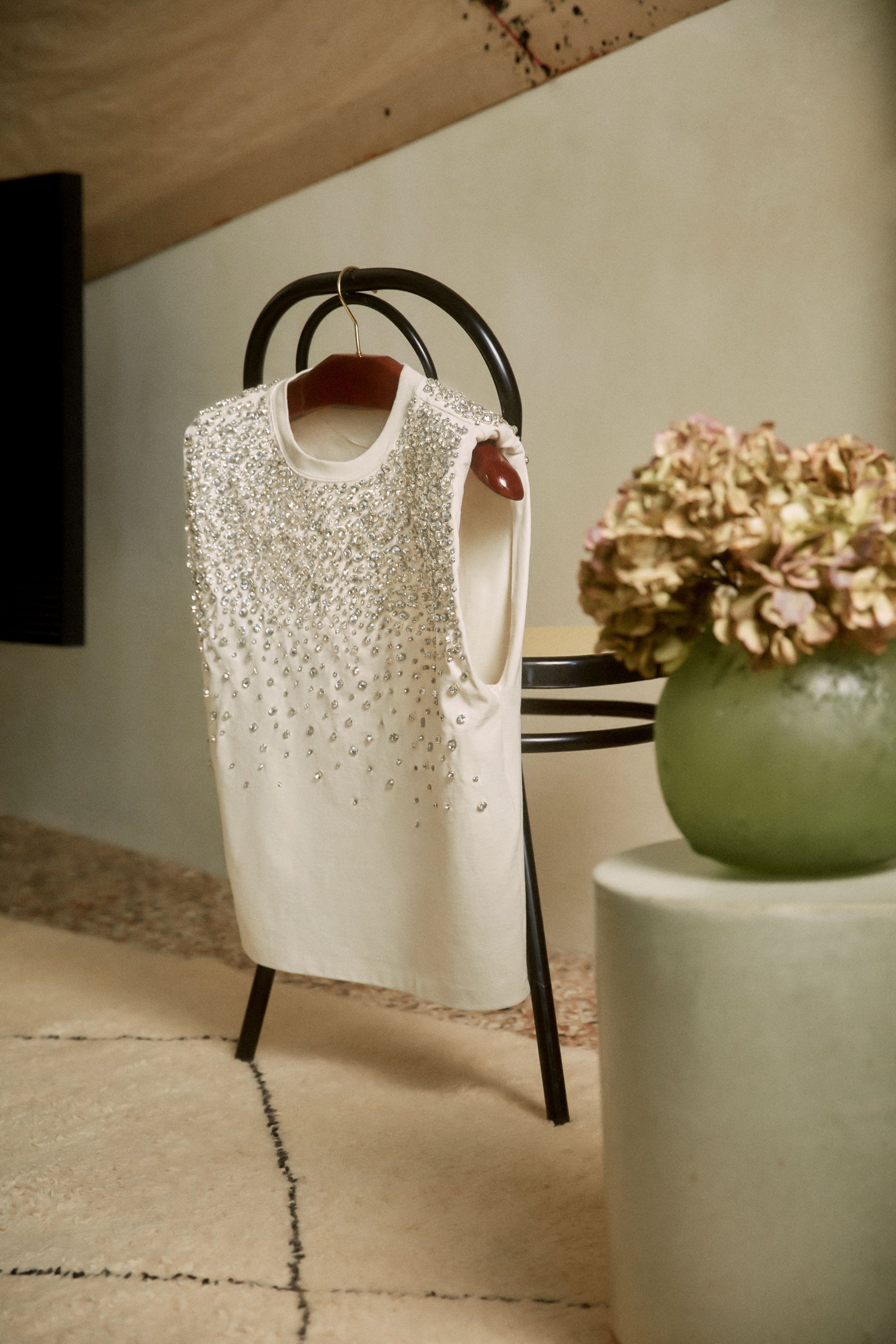このコレクションには、スキ・ウォーターハウスならではのナチュラルでグラマラスなテイストが効いたノースリーブのクロップドTシャツも登場。ショルダーパッドを入れたテーラードスタイルのトップスは、クラシックなブレザーのボリューム感を想起させます。前後ともに、4つの異なるサイズの円形と楕円形のスワロフスキークリスタルが、グラデーションを成すように手縫いでふんだんにあしらわれています。