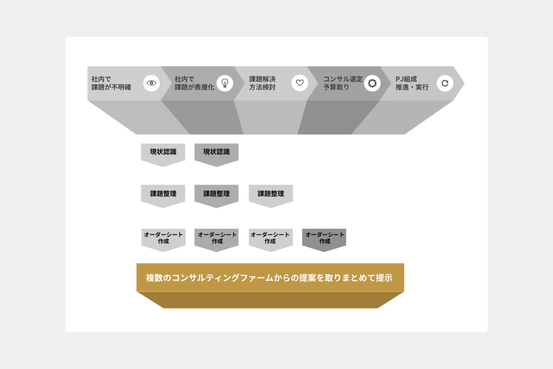 課題の整理からプロジェクト組成まで、コンサル選びを安心して進めるための総合的なサポートを提供
