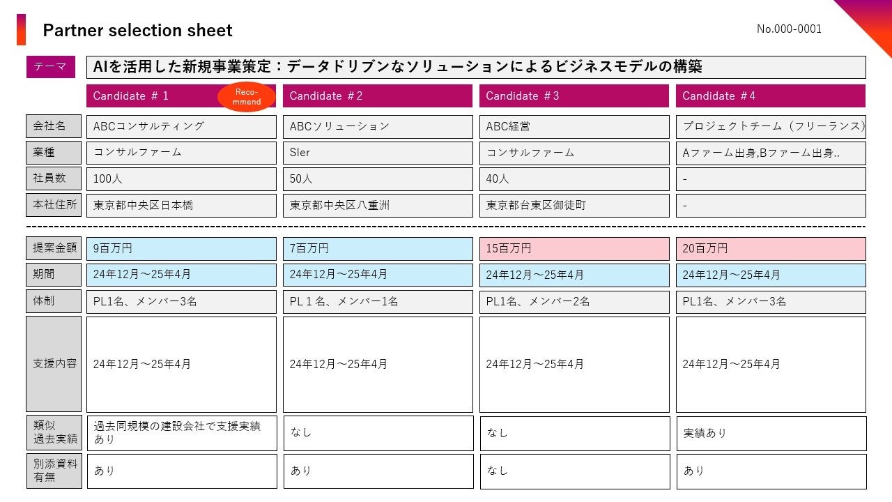 コンサルティングファームから利用料を頂くビジネスモデルを採用し、企業側の利用料は一切不要。予算やコストに悩むことなく、プロジェクトの質を最優先にパートナーを選定できます。