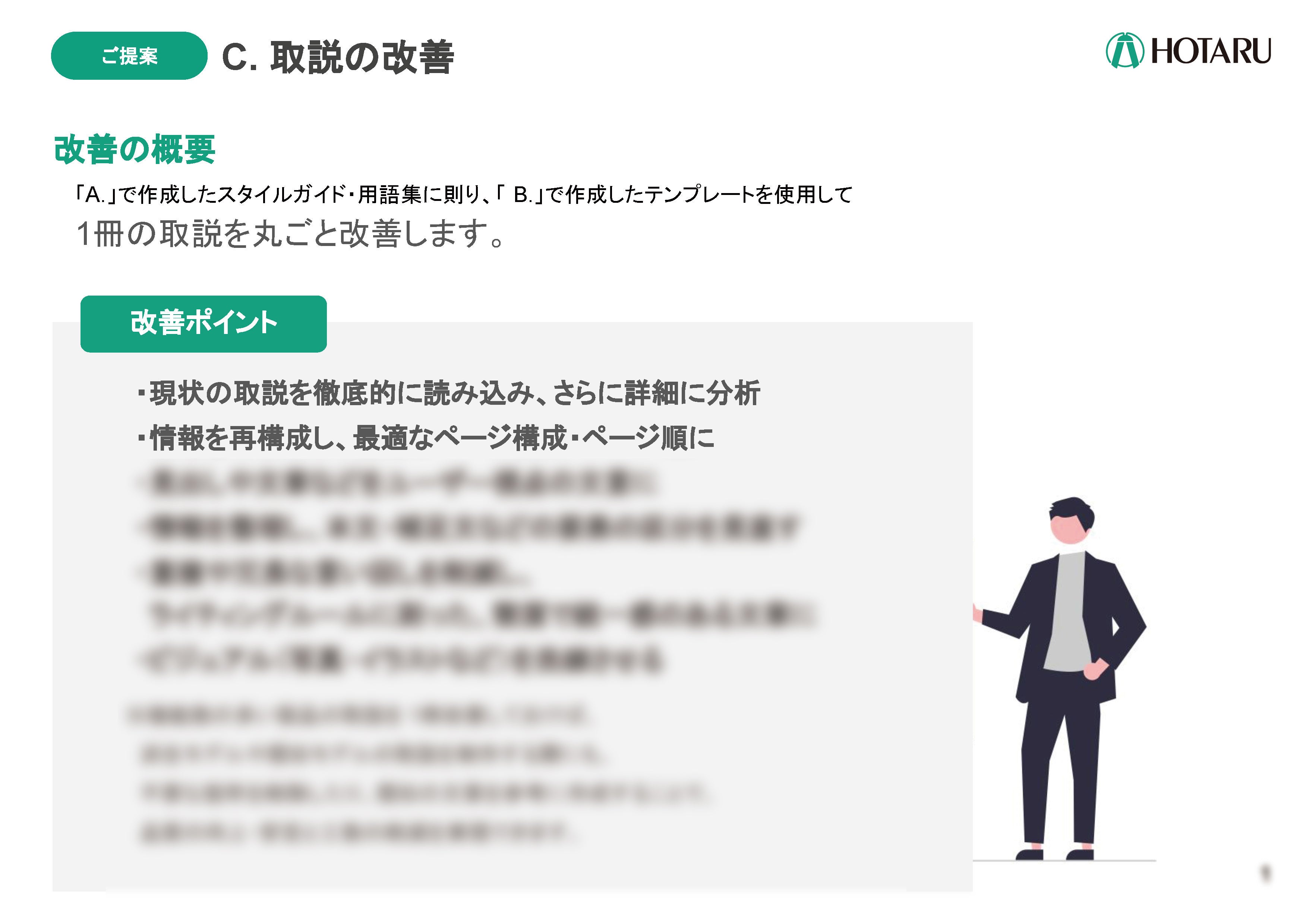 診断後にお渡しする「改善提案資料」は、診断によって洗い出された問題点をもとに、マニュアルの仕様、構成、デザイン・レイアウト、文章、イラストなど様々な観点から改善のポイントをご提案するものです。