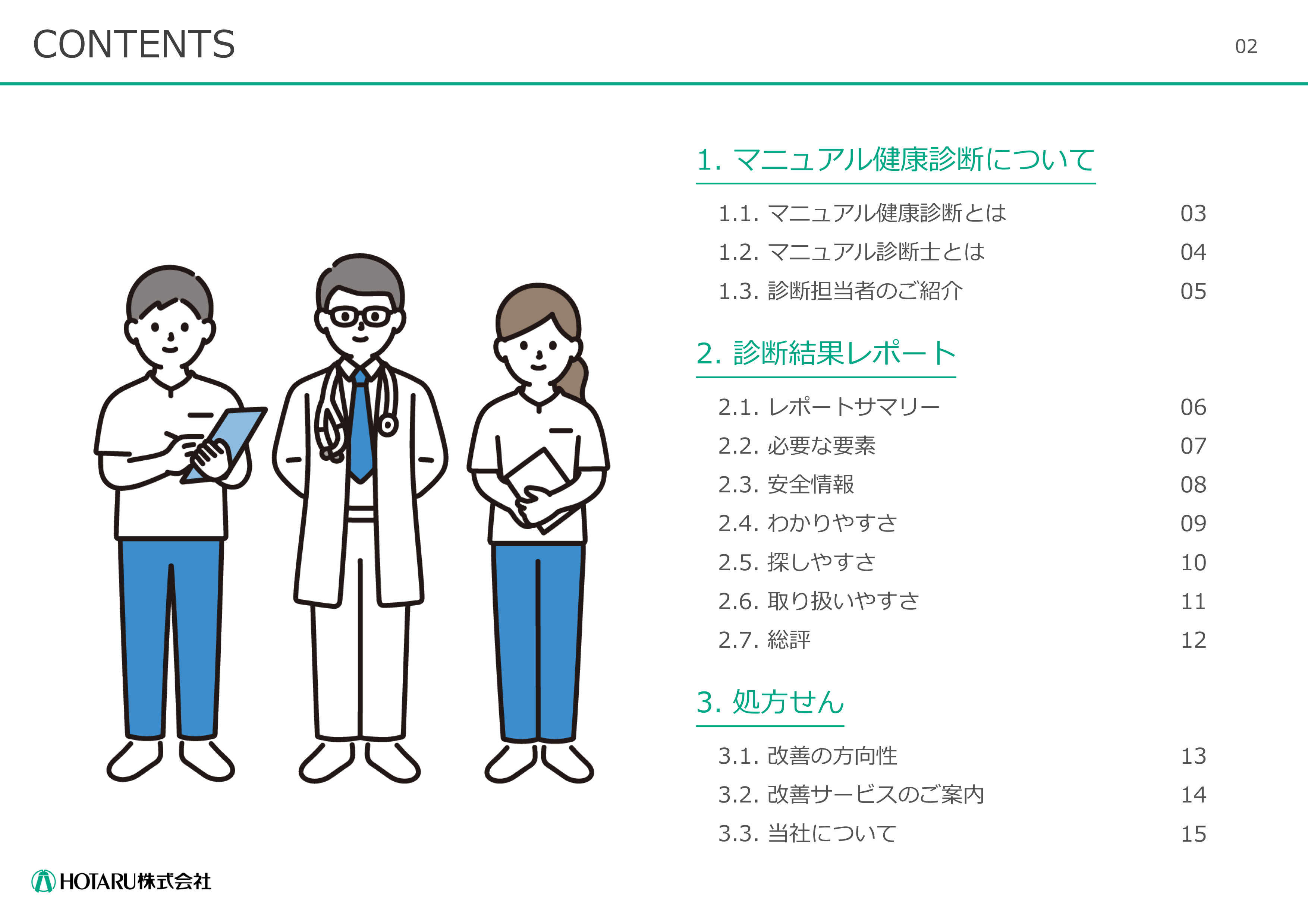 マニュアル健康診断の詳しい内容については、下記をご覧ください。