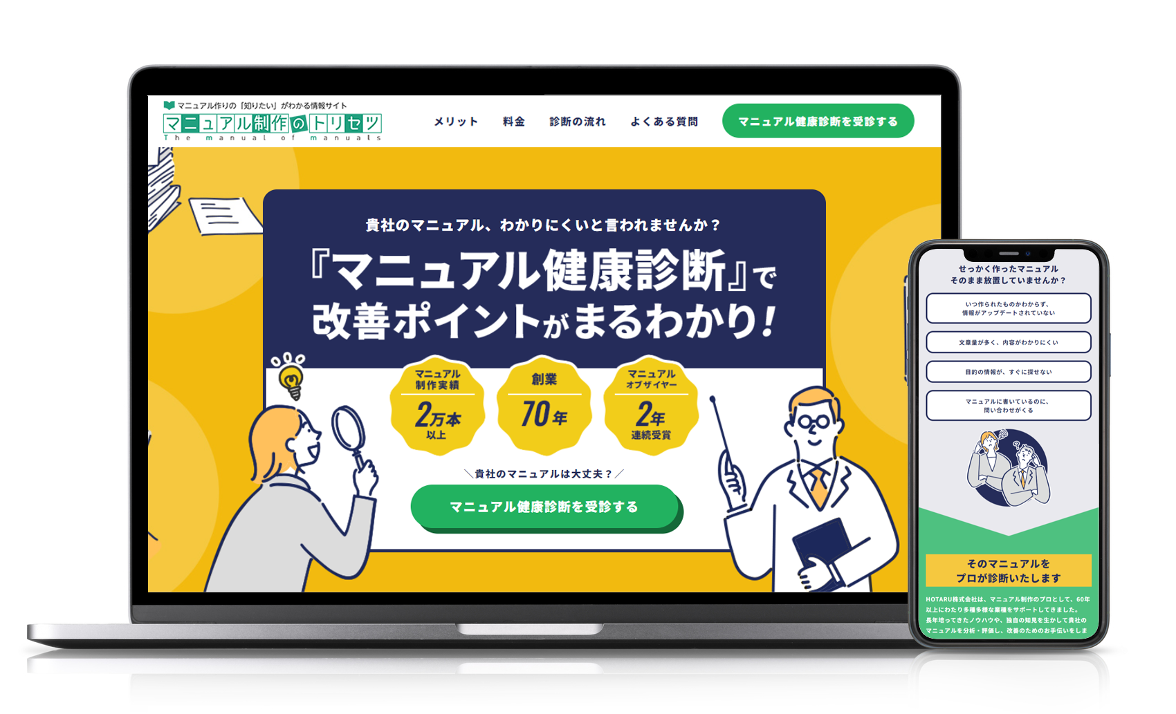 マニュアル診断サービス「マニュアル健康診断」は、紙・Webなどの媒体を問わず、製品のマニュアル(取扱説明書、工事説明書など)や業務マニュアルなどあらゆるジャンルのマニュアルを、マニュアル制作のプロが客観的に分析・評価するサービスです。