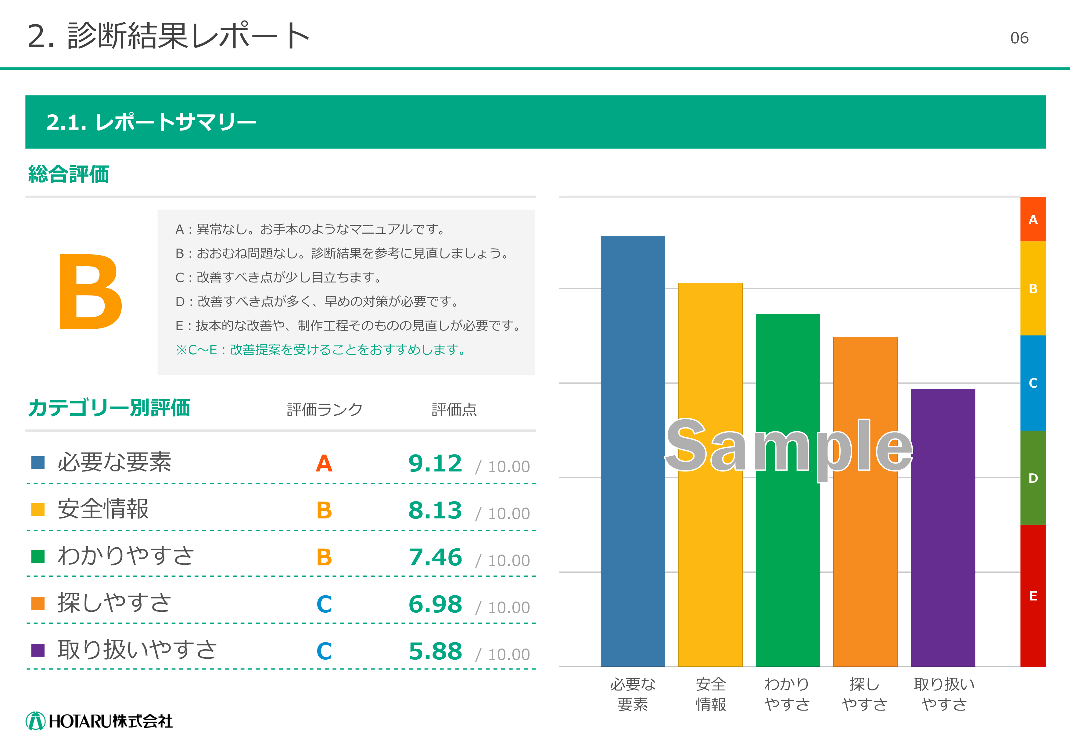 マニュアルの国際規格「IEC/IEEE 82079-1:2019」のほか最新のトレンドを加味した当社独自の視点で、「必要な要素・安全情報・わかりやすさ・探しやすさ・取り扱いやすさ」の5つの要素を軸に、およそ100の評価基準をもって、評価対象となるマニュアルの「強み・弱み」を明確に分析します。