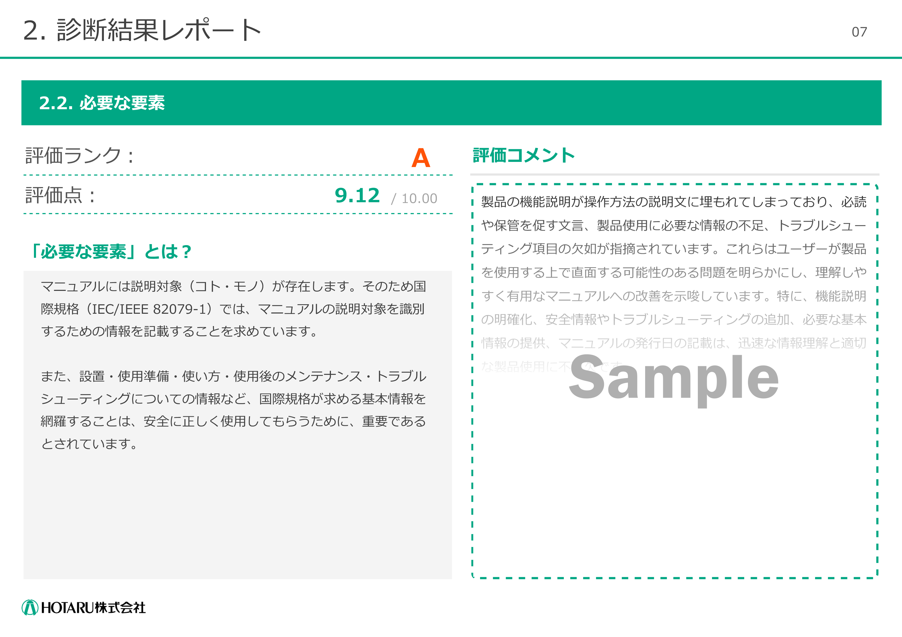国際規格「IEC/IEEE 82079-1:2019」や最新のトレンドを加味した独自の評価システムにより、マニュアルの問題点を見える化します