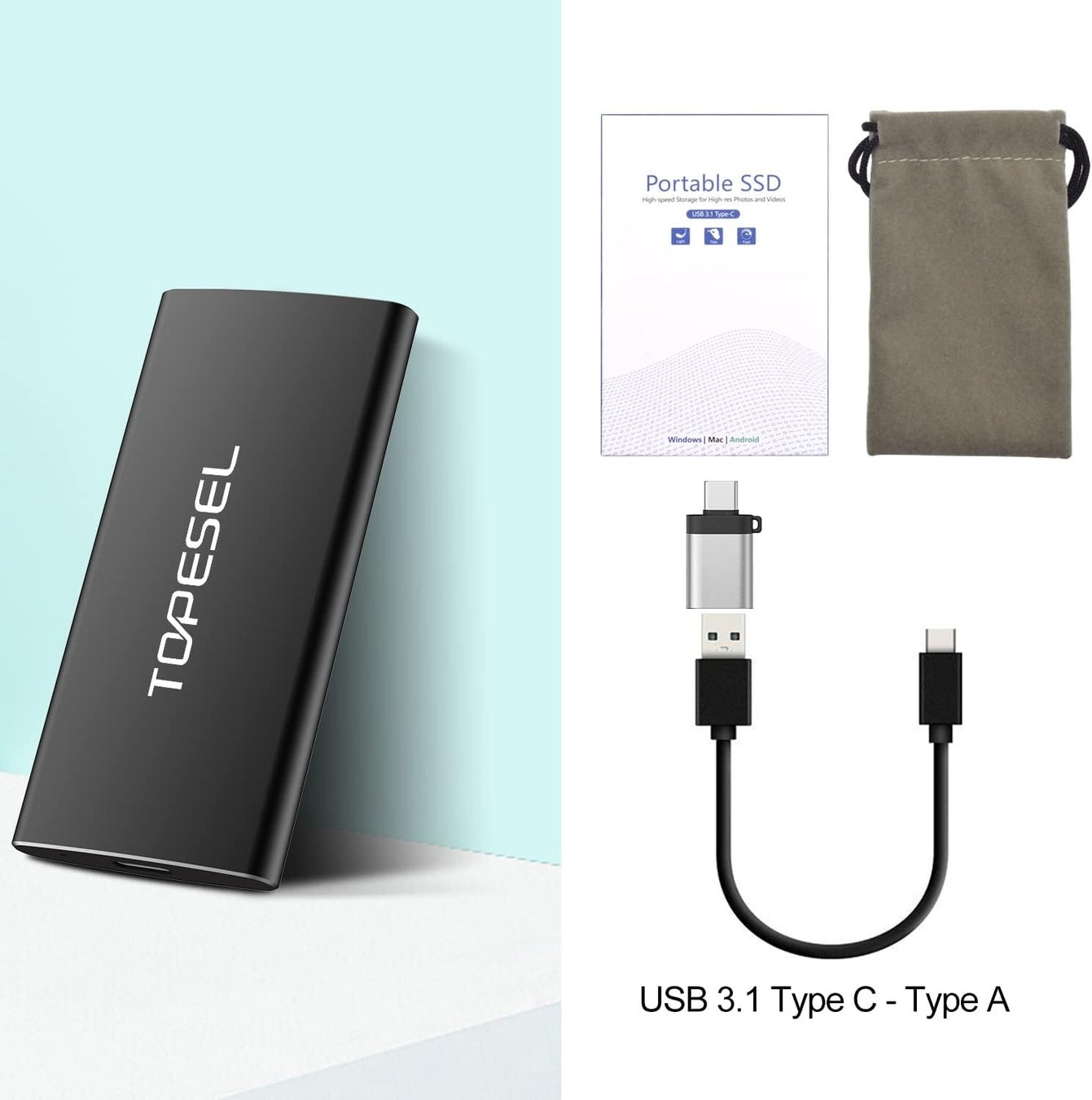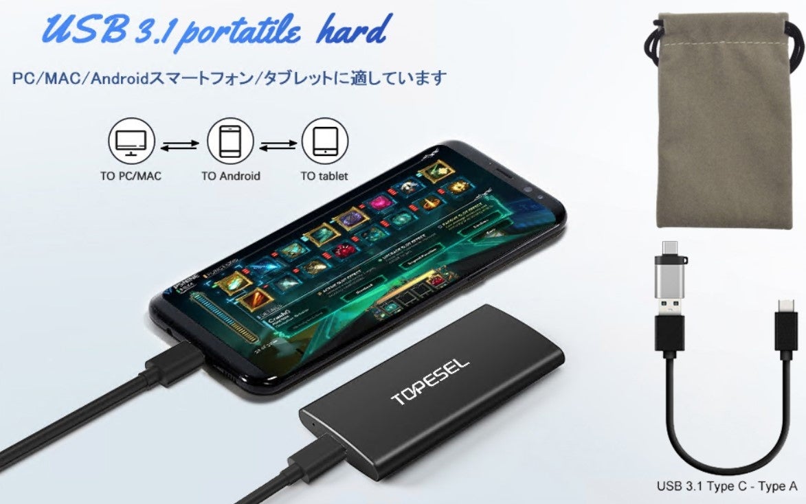 TOPESEL ポータブルSSD 1TB USB3.1 Gen2 外付けSSD PS4/ラップトップ/X-boxに適用 ssd 外付け 転送速度500MB/秒(最大) 収納袋付き 超高速 耐衝撃 軽量 Type-A/Type-C 対応 黒