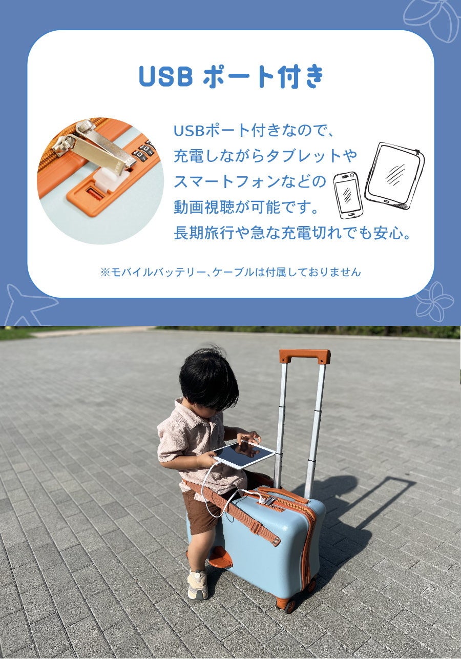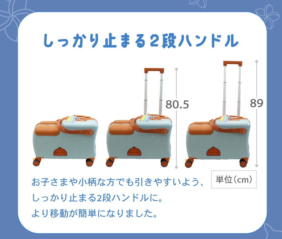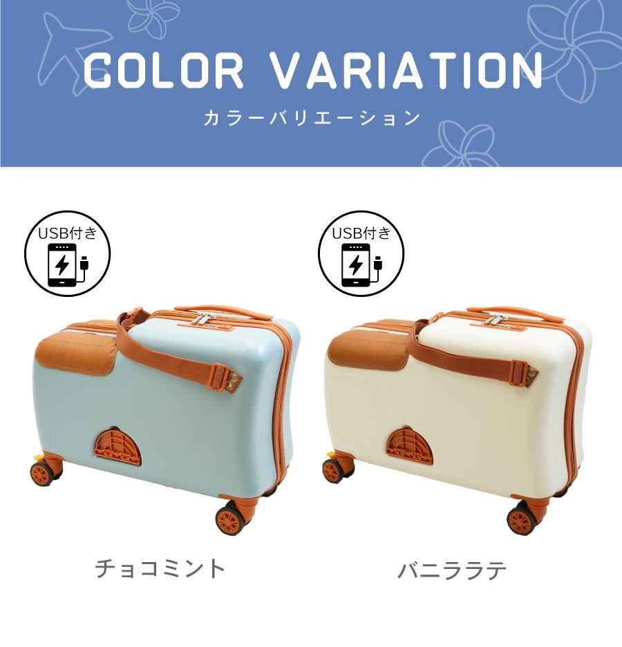 子供がワクワクして自ら乗りたくなるデザインで家族旅行の負担が軽減。機内持ち込みが可能なサイズで空港での煩わしい待ち時間が不要な乗れるスーツケースを独自開発、より使用しやすくなりました。