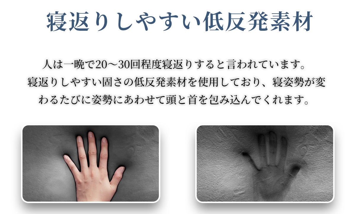 人は一晩に20~30回程度寝返りを打つと言われています。「低反発枕」は、寝返りのしやすさを追求した適度な固さの低反発素材を採用。寝姿勢に合わせて頭と首を優しく包み込み、快適な寝返りをサポートします。また、ウレタンフォームの密度が40Dを超えることで、製品の耐久性も高まり、8年以上の長期使用が期待できます。