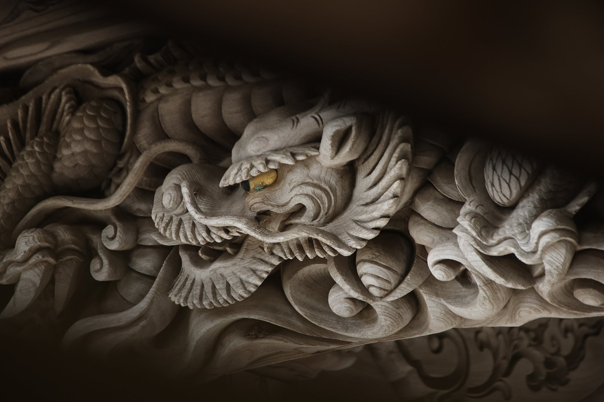 拝殿向拝天井には、幸福をもたらすと伝えられる巨大な龍が壮麗に施されている。龍が握りしめる巨大な如意宝珠は、神聖なる玉として知られ、様々な願いがかなうと伝えられている。玉の真下に印があり、この場所はパワースポットとして崇められています。