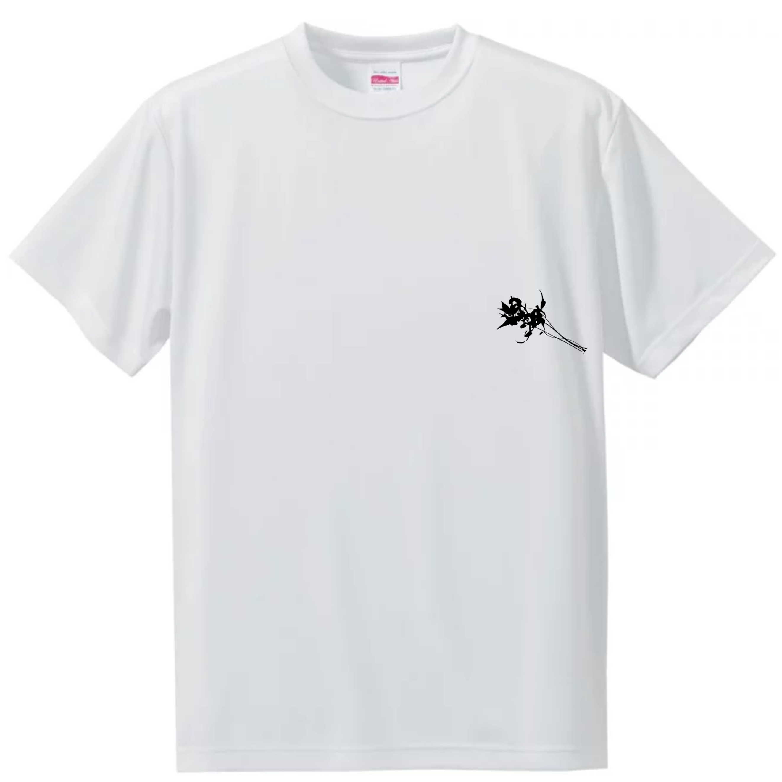 複数の作品が重なることで広がる世界観を持つ作品「累 kasane」のプリントTシャツ。ブローチやタトゥーのようにデザインされた小さな花束は、凝縮した華やかさを感じさせます。