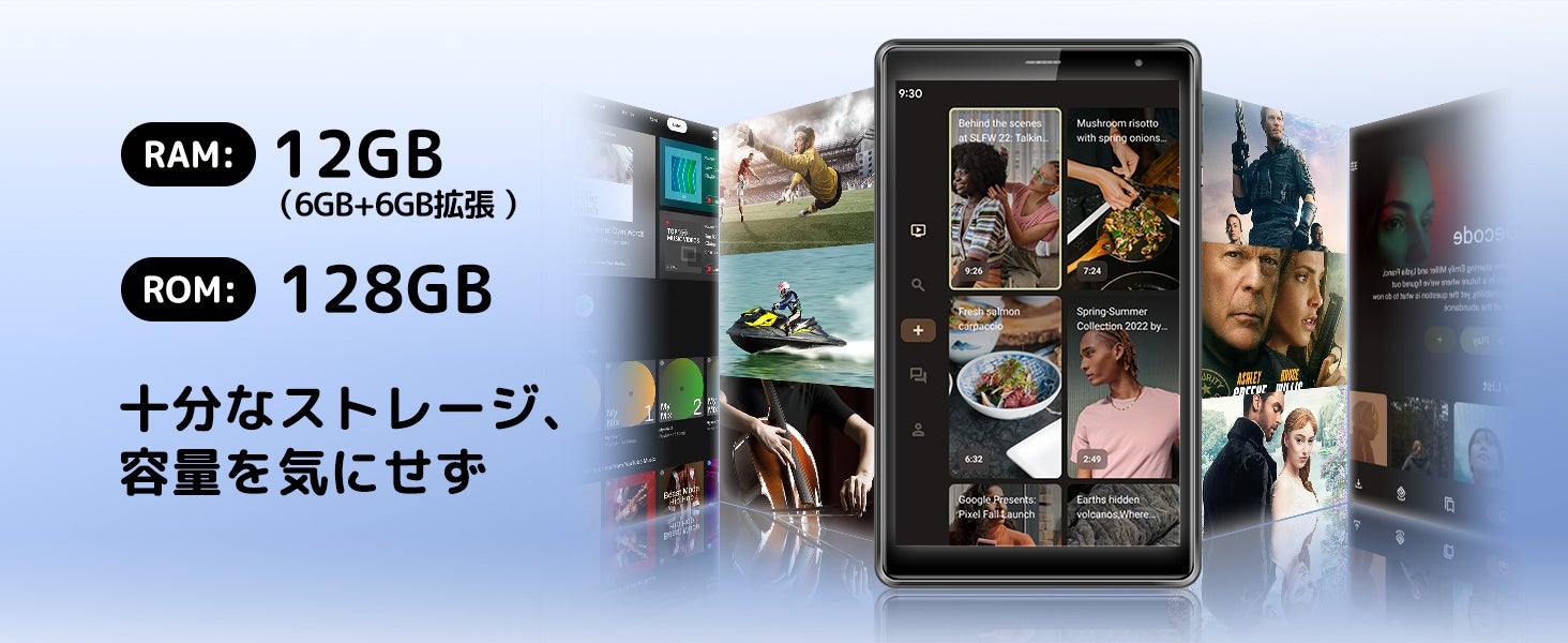 T30Proには6GBのメモリが搭載されており、RAMの拡張機能を使うと最大12GBまで仮想メモリに回せます。合計大容量12RAMを搭載するため、よりスムーズに操作できます。128GBのストレージで、写真、ビデオ、ドキュメントをたくさん保存できます(最大1TBまで拡張可能/FAT32形式、別売り)。また、UNISOC T606パワフルな8コア高速処理チップを搭載し、ストレスなく、サクサクと動きます。更に、12nmプロセステクノロジーを採用しており、発熱を抑えながら、低消費電力を実現します。