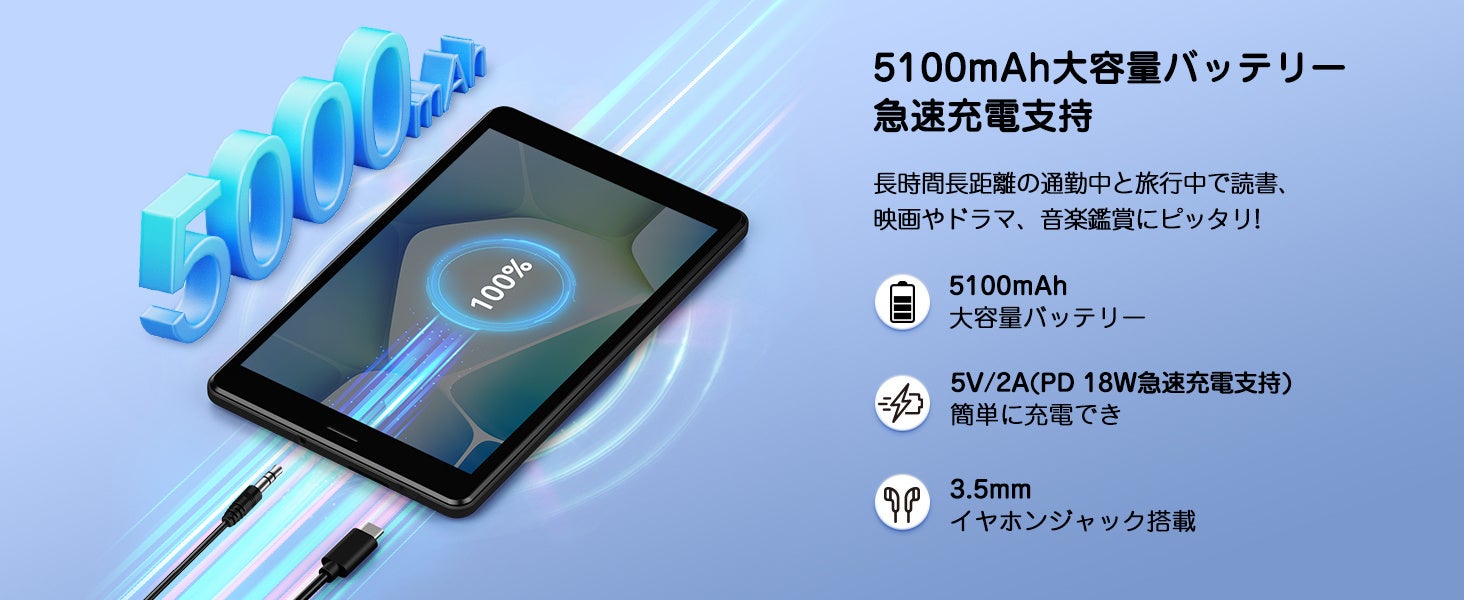 T30PROタブレット androidはPD18w対応で充電時間が短い、5100mAh バッテリーを搭載し、AIインテリジェント電源管理により、最大10時間の長時間使用が可能です。タブレット本体サイズは21*12.6*0.9CM 重量は340g 超軽量運び待ちは便利、薄く使い勝手が良く、初心者にも簡単利用できてお子様への最高の贈り物です。読書モード、目を保護モード、分割画面機能、ワイヤレス投影、OTG対応など幅広く利用できます。
