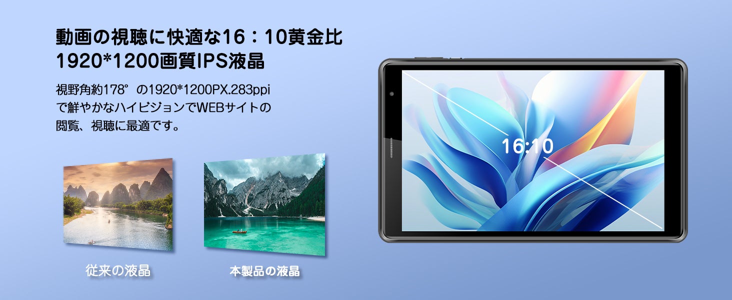 Android 13 タブレット8インチ |1920* 1200 IPSディスプレイ|顔認証 |GPS 搭載|18W急速充電|Widevine L1対応 |プロセッサはUNISOC T606 |RAM:12GB(6GB+6GB拡張) |ROM:128GBで|実機でのAnTuTuベンチマークスコアは27万以上です。