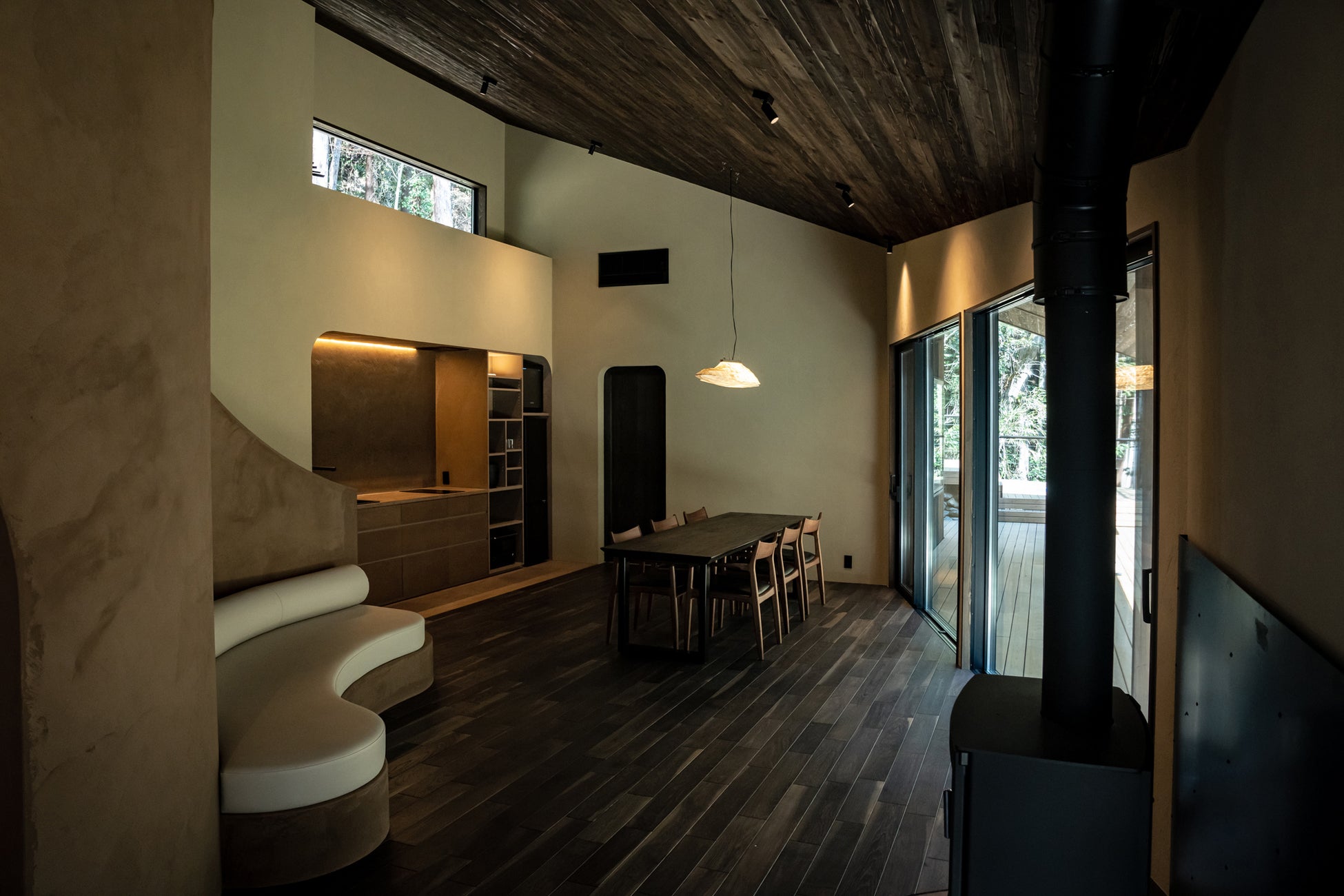室内では、土の左官がゆるやかな曲線を描き、光を柔らかく反射しながら空間を包み込みます。まるで洞窟の中にいるような安心感と、木々の揺れを映す自然光が共存する設計です。