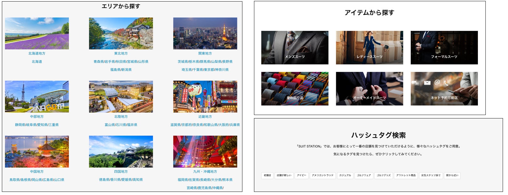 新:地域検索、アイテム別検索、ハッシュタグ検索(キーワード検索)、予約可能店検索