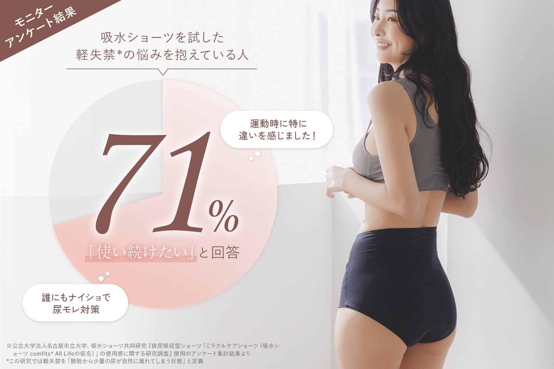 comfits 「All Life」を試用した軽失禁の悩みを抱える方の71%が、『使い続けたい』と回答。また、『ネガティブな気持ちや不安感が減った』という声も63%に上ります。日常生活が楽になり、自信を持って過ごせるようになったという声も寄せられています。
