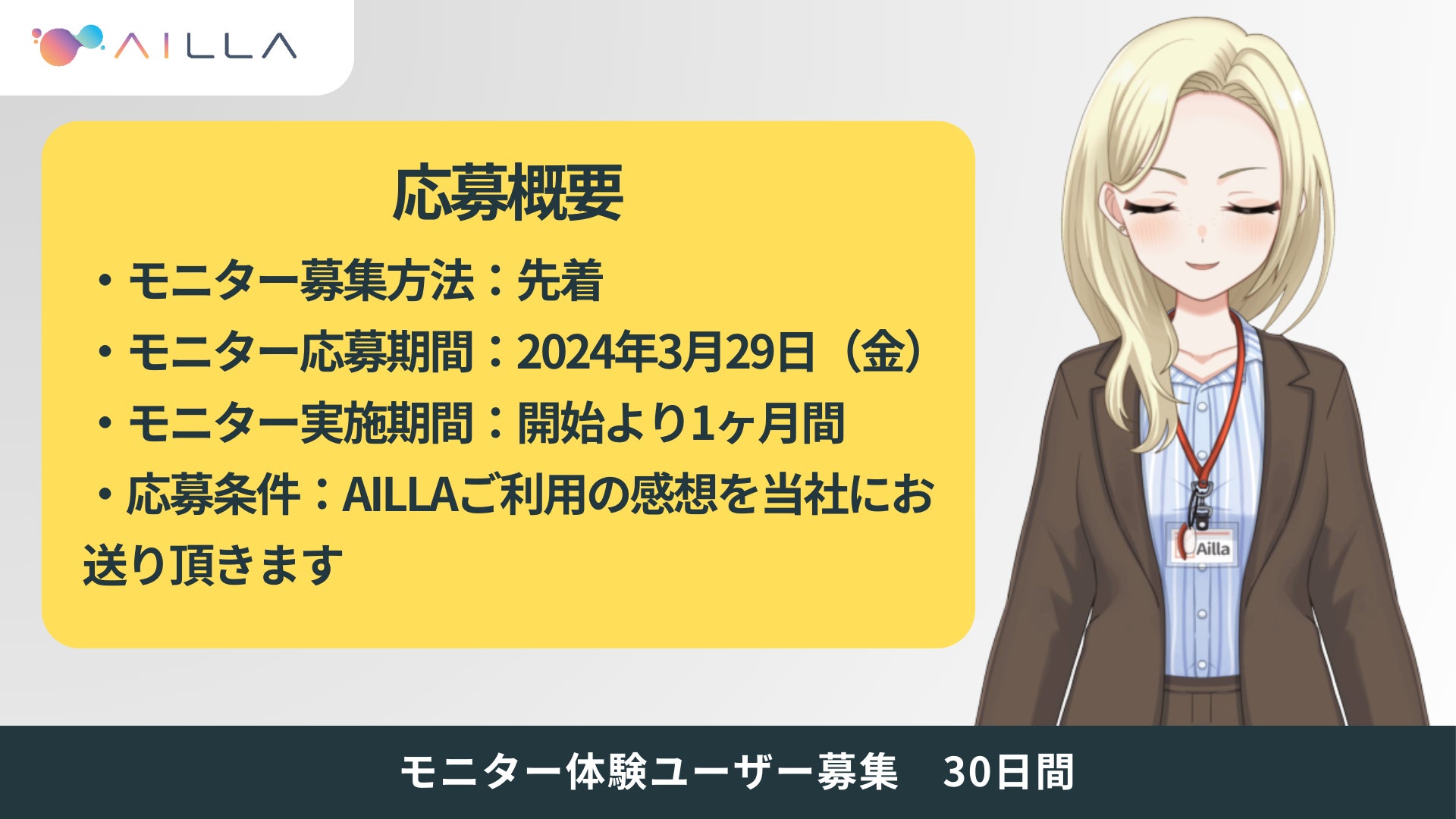 モニター募集キャンペーン申し込みフォーム: https://aivy.tokyo/ailla-monitor