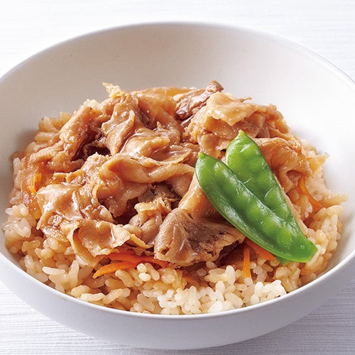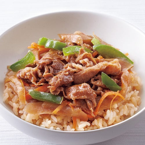 柔らかい豚肉と玉ねぎ、にんじんをほどよい大きさに切り、生姜の風味を生かした醤油ベースのタレに絡めて、旨味を引き立てました。絹さやで彩りを加えています。佃浅商店ならではの優しく甘辛い味わいで、ご飯も進みます。