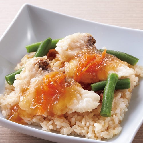 あっさりした味わいながら上品な甘さを持つのが、国産の鰆。食べやすく三枚におろして揚げました。鰹出汁に黒酢で優しい酸味を加えた、爽やかな餡を合わせることで、ご飯の美味しさも引き立てています。