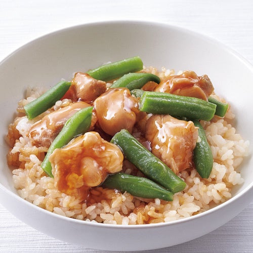 食べやすい大きさにカットした鶏肉を、甘辛い特製ダレでじっくりと照り煮し、口当たりもふっくら優しく仕上げました。世代を超えて人気の味わいで、ご飯との相性も格別です。具材に加えたインゲンの緑色が、美しい彩りを添えています。