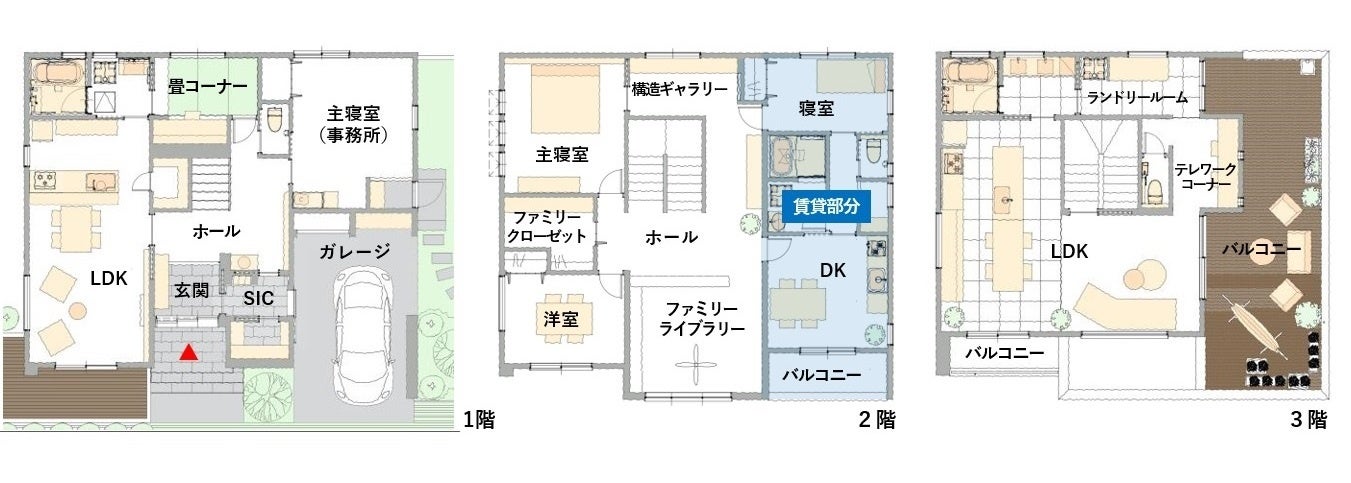 【間取り】働き盛りのご夫婦家族と、ご両親の同居世帯をイメージしたプランニングです。世帯間での適度な動線交差と交流スペースを設け、程よい距離感で生活していただけるレイアウトをご提案しています。またエリアニーズを捉えて設置したビルトインガレージには雨の日にも濡れない動線を確保、更に収益性のある賃貸部分の計画提案も取り入れています。