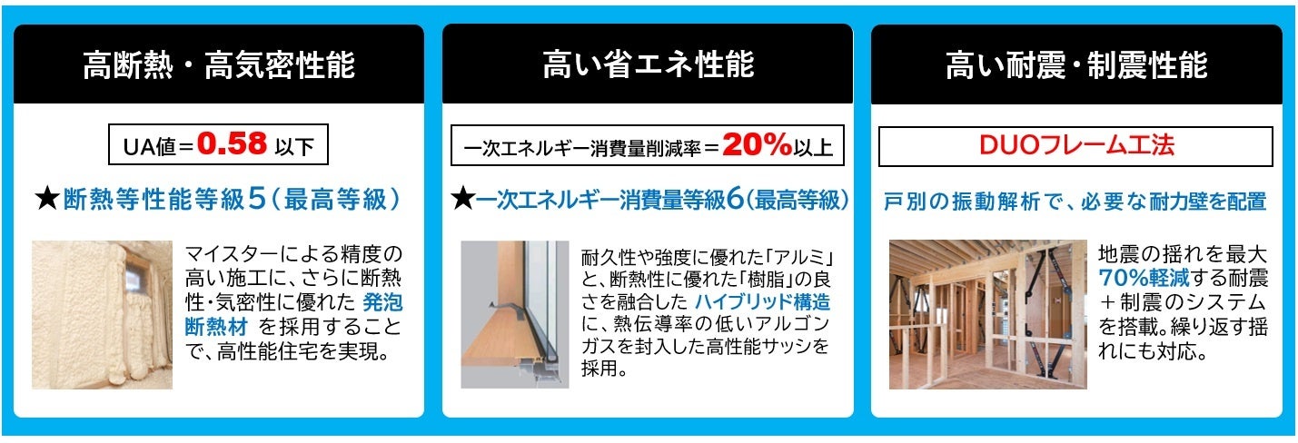 ZEH基準を超えた高断熱・高気密による住宅性能の向上で、空調効率の良い省エネ住宅を実現し、さらにエネルギーの自給自足に向けた太陽光発電システムや蓄電池の採用は、自然災害時にもご家族の生活を守ります。