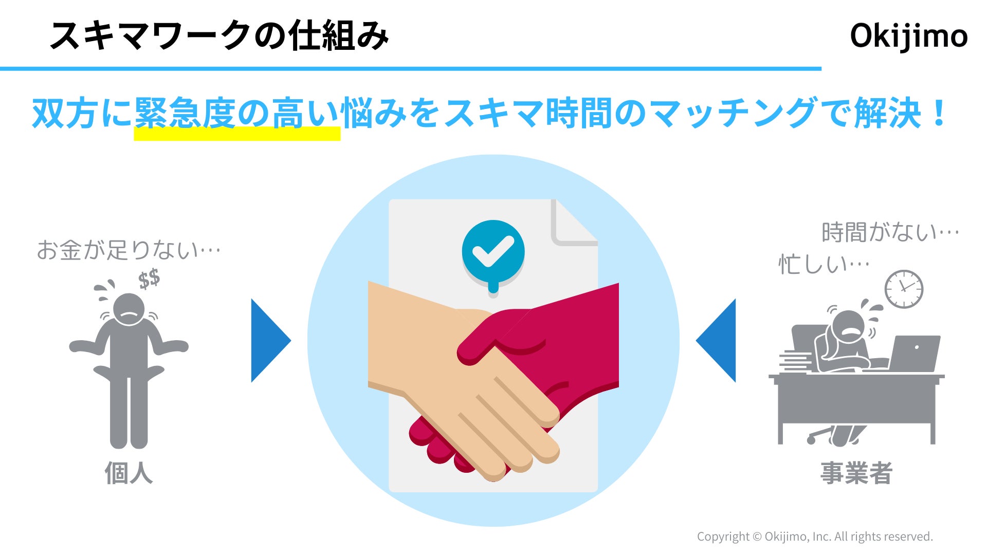 スキマワークとは、事業者が必要な時間帯や特定の業務に合わせて、短期間でピンポイントに人手を確保できる求人サービスです。求職者は空いた時間を活用して働くことができるため、柔軟な働き方が可能です。これにより、事業者は効率的に人材を活用し、求職者は自分のライフスタイルに合わせて働くことができます。