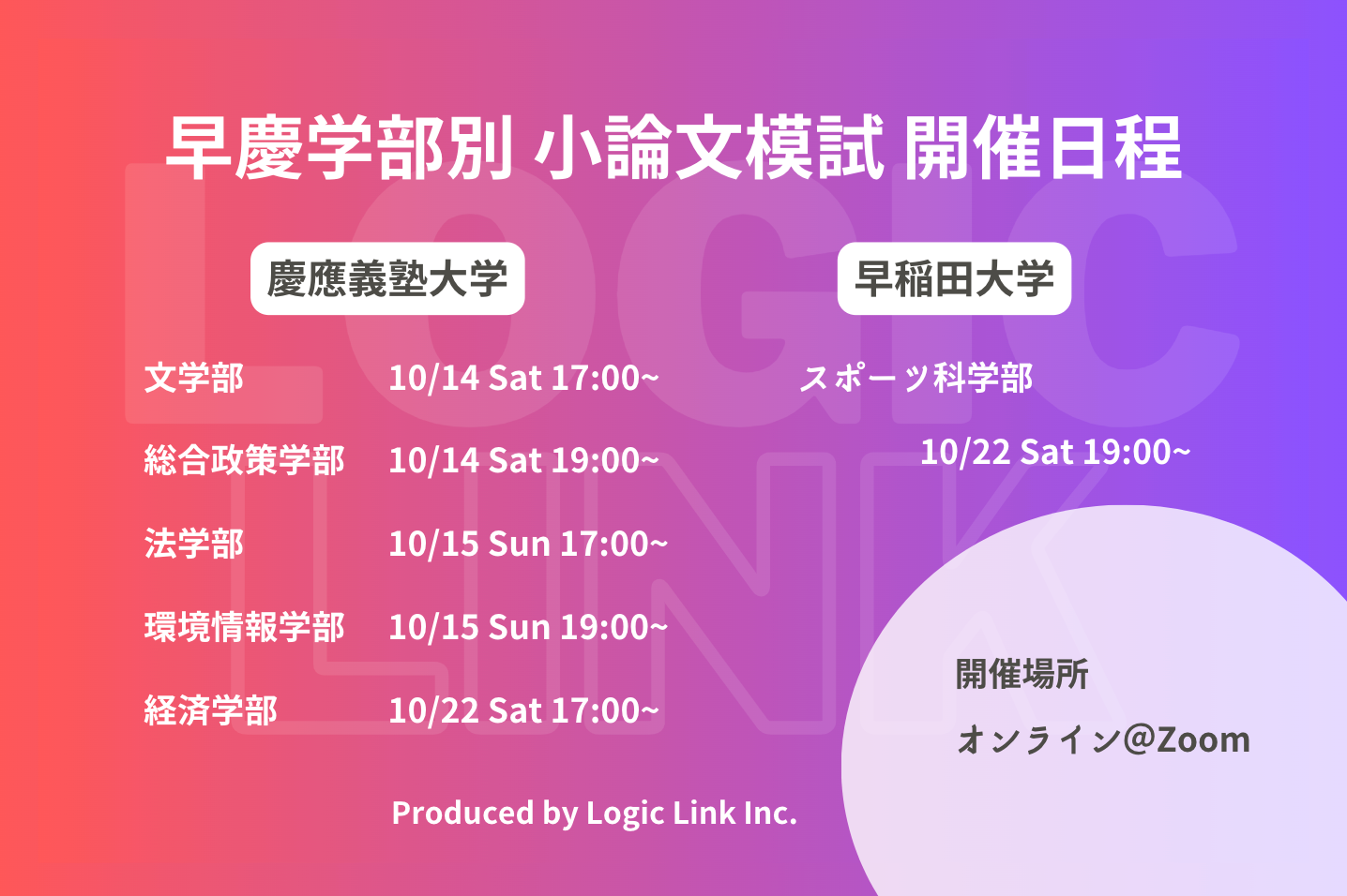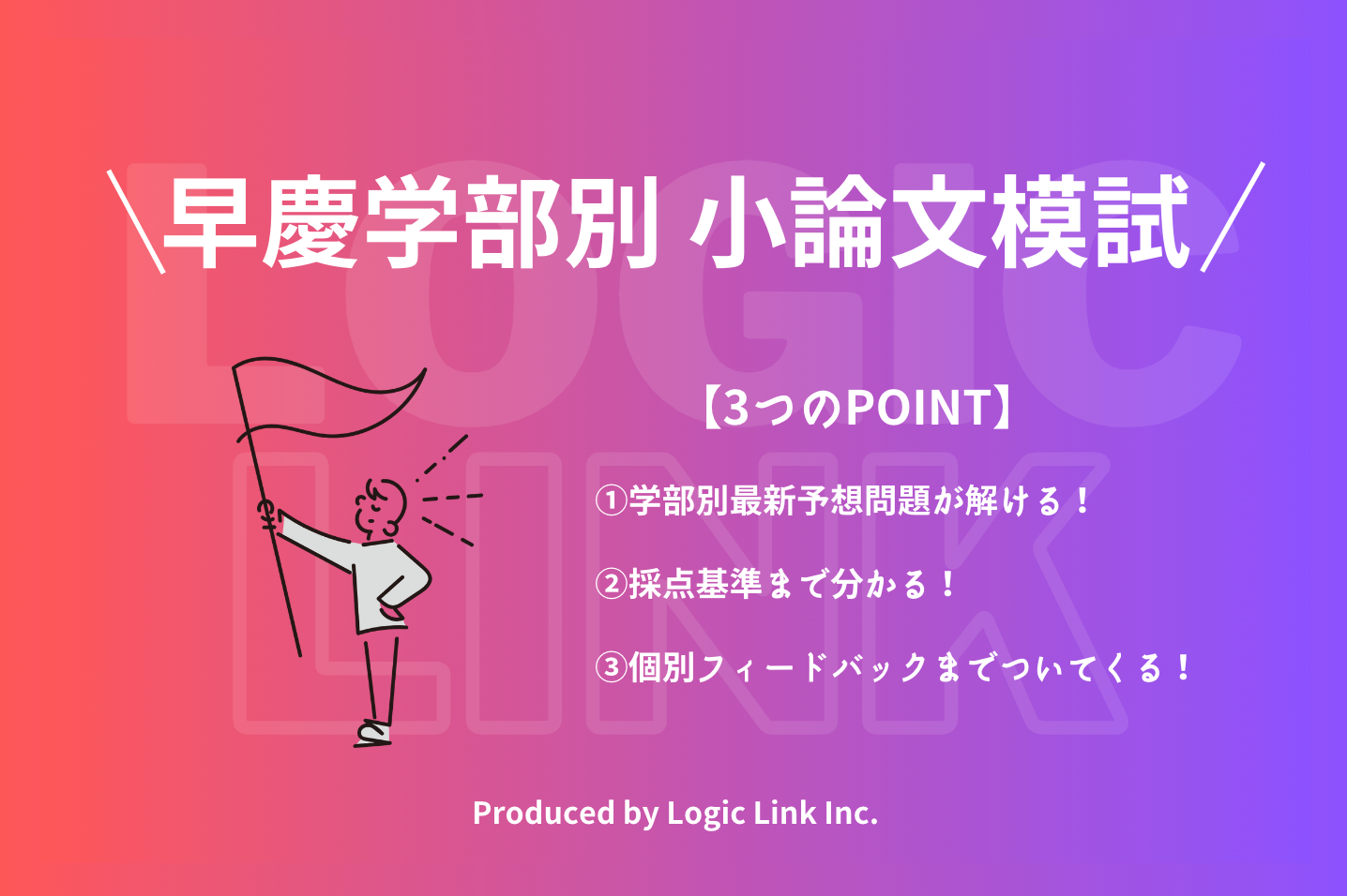 株式会社Logic Linkが運営するオンライン小論文塾Logic Linkが、【早慶学部別小論文模試】を開催します。参加者随時募集中です。