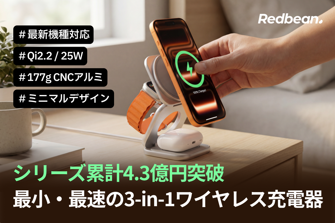 韓国発ガジェットブランド「Redbean(レッドビーン)」は、2026年3月20日よりクラウドファンディングサイト「GREEN FUNDING」にて、次世代ワイヤレス充電規格「Qi2.2」に対応した3-in-1急速充電器『P1 mini』の先行予約販売を開始いたしました。開始直後から多くの反響を呼び、目標金額を即座に達成。現在、ゴールデンウィークの旅行や出張に間に合う「早期発送リターン」の受付を期間限定で実施しております。