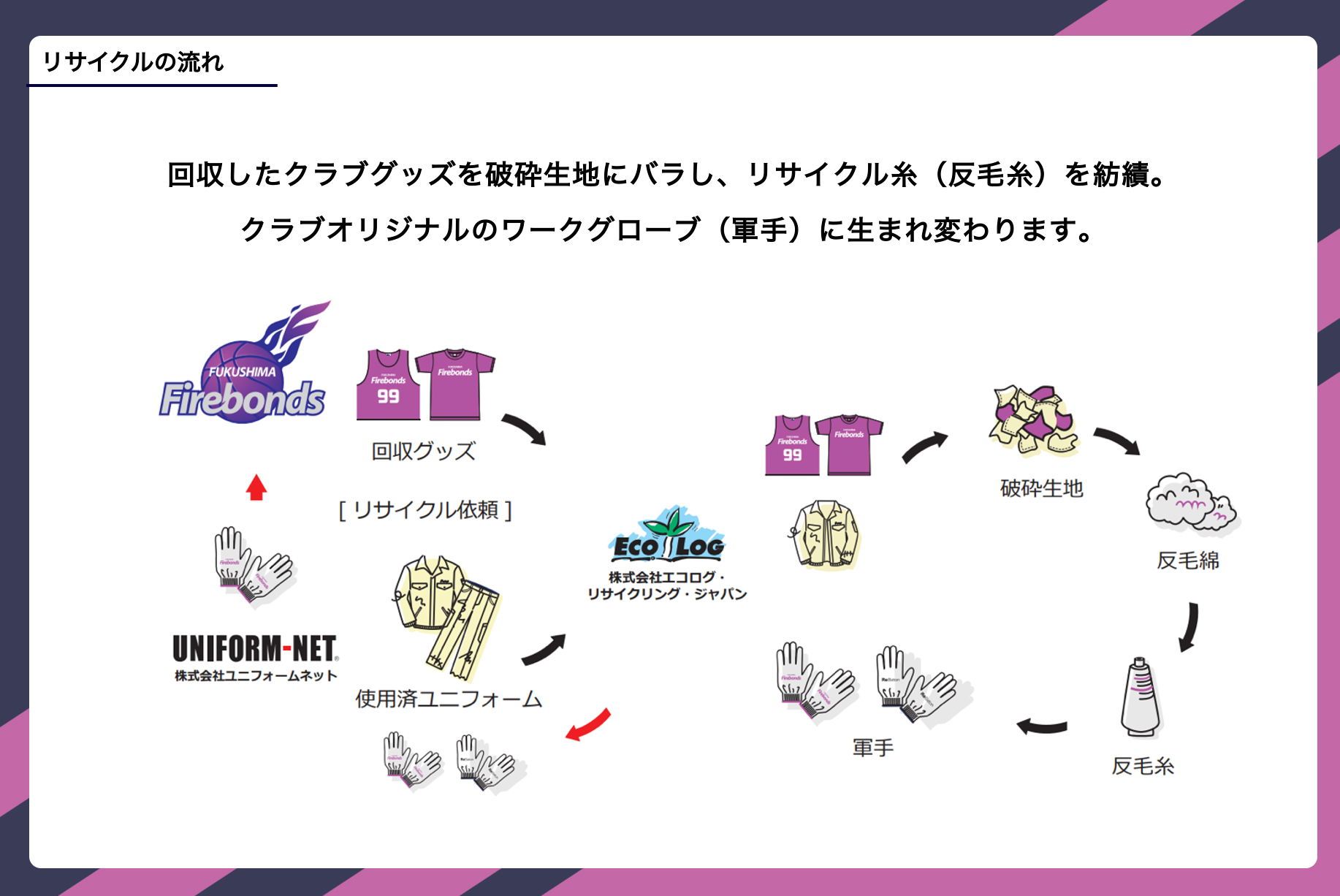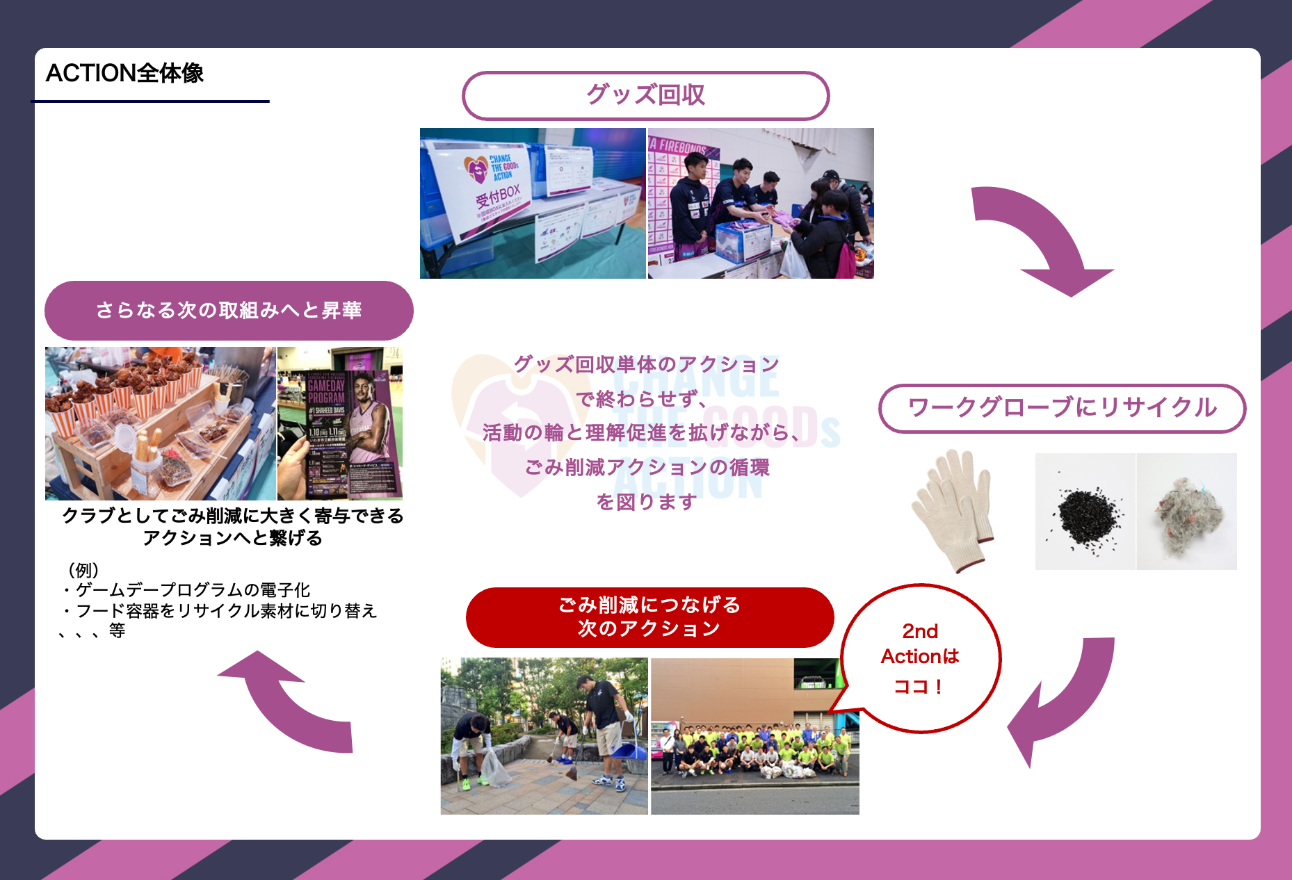 福島ファイヤーボンズでは、廃棄される可能性のあるクラブオフィシャルグッズを回収してワークグローブ(軍手)にリサイクルし、それらを使用しながら清掃活動などをファンとともに行う「CHANGE THE GOODs ACTION」を始動させており、6月8日(土)には第2弾としてファンの方と取り組むごみ拾いワークショップを開催する予定です。(下記詳細)