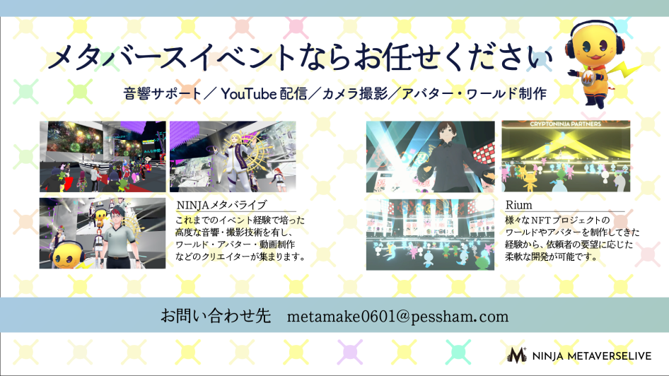 NINJAメタバライブはこれまでのイベント経験で培われた、高度な音響技術を有しています。またアバタークリエイター、ワールドクリエイター、YouTube同時配信やカメラマン撮影、動画パフォーマンスなど、高度なクリエイターが集まっています。これまでレゲエミュージシャンの三木道三氏、SABOTENのキヨシ氏などのご出演、演歌歌手の八代亜紀氏のコンサートの配信サポート等の実績があります。