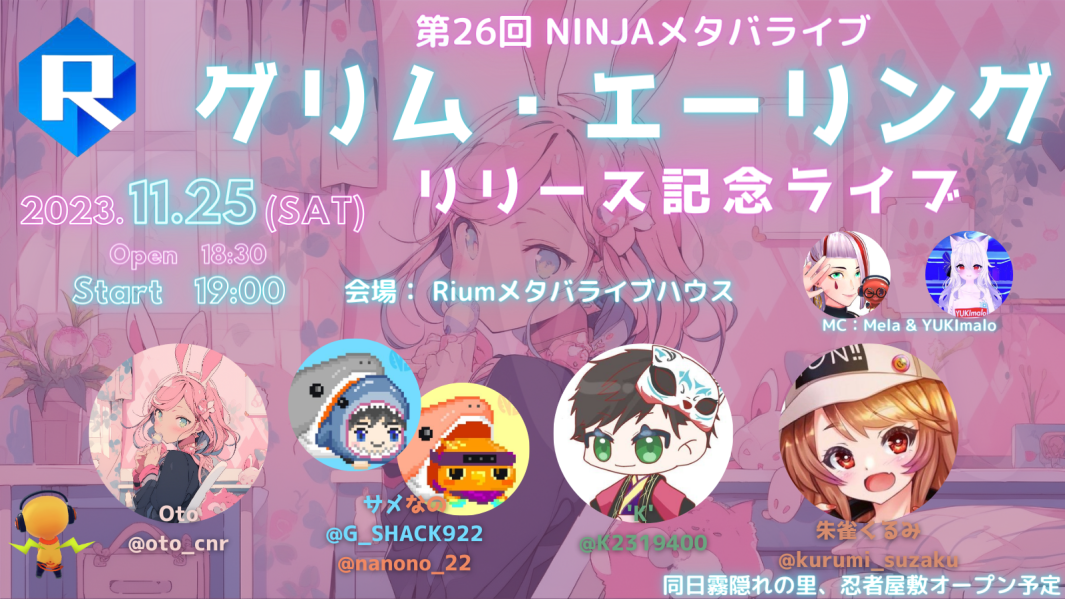 第26回NINJAメタバライブは11月25日にメタバースプラットフォーム「Rium」で開催され、バーチャルシンガーOtoを始め、サメなの、’K’、朱雀くるみが出演。