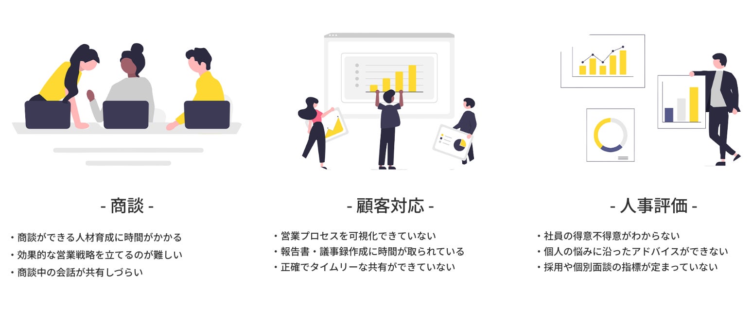 日常的に業務改革に取り組んでいる税理士事務所でも、顧客との会話や人材採用面接の内容の把握が難しく、経営層から現場担当者レベルまで、会社として適切な営業戦略や人材採用などの属人的な業務に課題を抱えています。