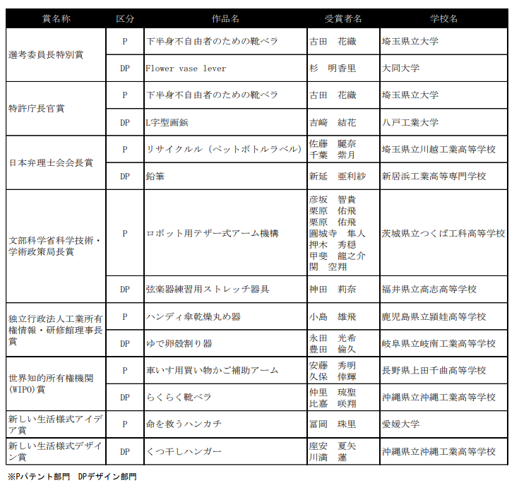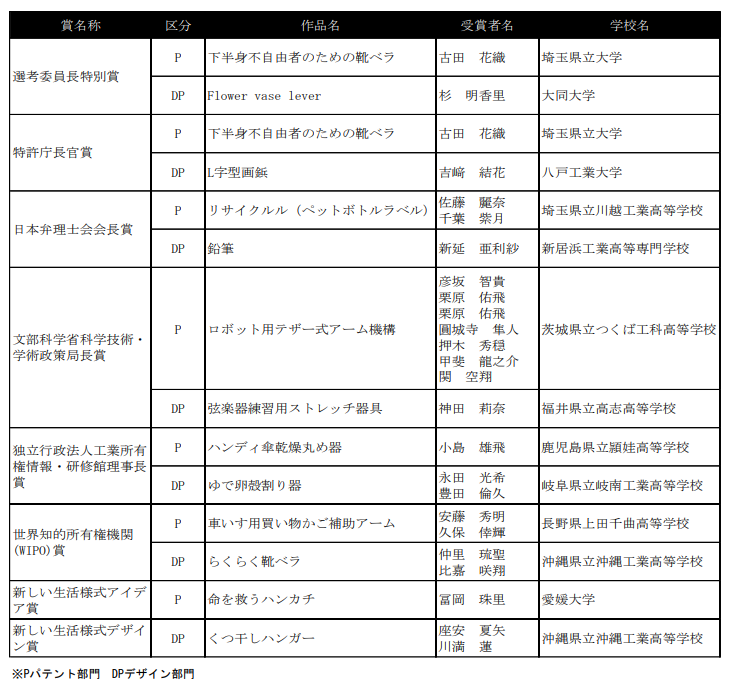 このコンテストで優秀賞として表彰された応募作品は、特許または意匠登録出願支援対象となり、日本弁理士会の弁理士が手続き等を指導し、実際に特許庁への出願を行うことができます。