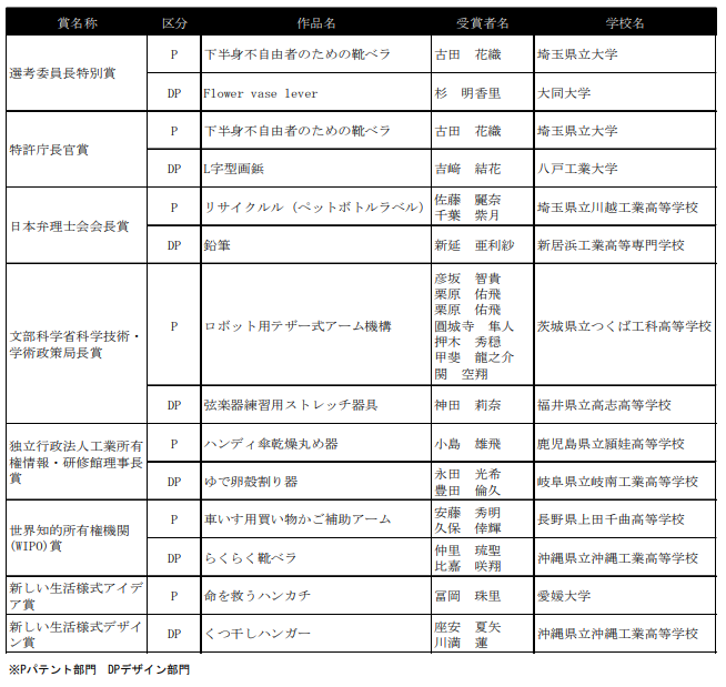 文部科学省・特許庁等が主催する「パテントコンテスト/デザインパテントコンテスト」は、全国の高校生や大学生等が自ら考え出した発明及びデザイン(意匠)のうち優秀なものを表彰し、実際に特許庁への出願を支援することで、若い世代の知的財産権制度への理解を深めることを目的としたコンテストです。