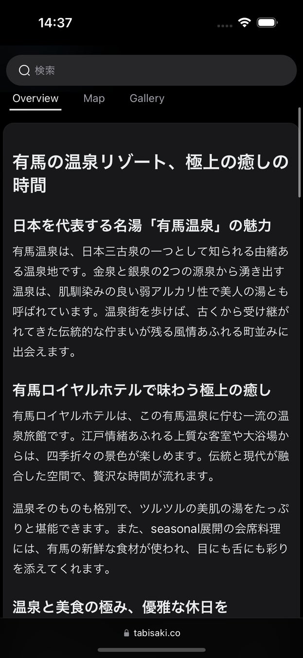 Tabisakiは、日本各地の観光情報を提供するオンラインメディアです。訪日観光客に向けて、地域ごとの詳細な観光ガイド、レストランや宿泊施設のレビュー、現地のイベント情報などを提供しています。生成AI技術を活用することで、大量のコンテンツを効率的に生成し、ユーザーに最新かつ魅力的な情報を提供しています。