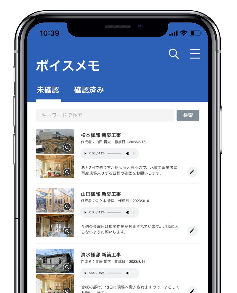 住宅建築の場合、1つの現場を完成するために、40社以上の協力業社が関わり、日々のコミュニケーションは電話が中心です。また、監督・職人ともに複数現場を同時に抱えており、作業指示や注意事項など、どの現場の指示だったか混在することも多く、現場が絡むコミュニケーションは、「言った・言わない」が多く発生しているという課題を、多くの工務店からいただいておりました。