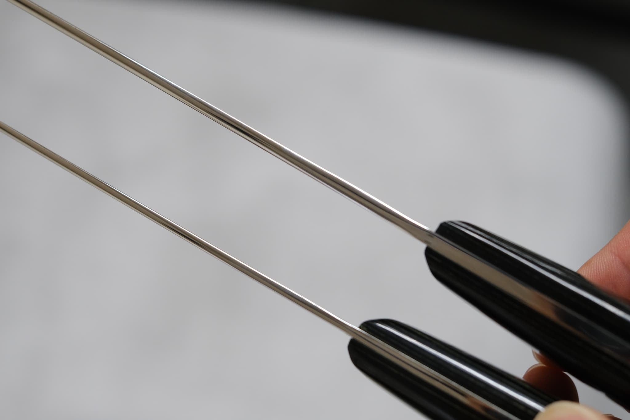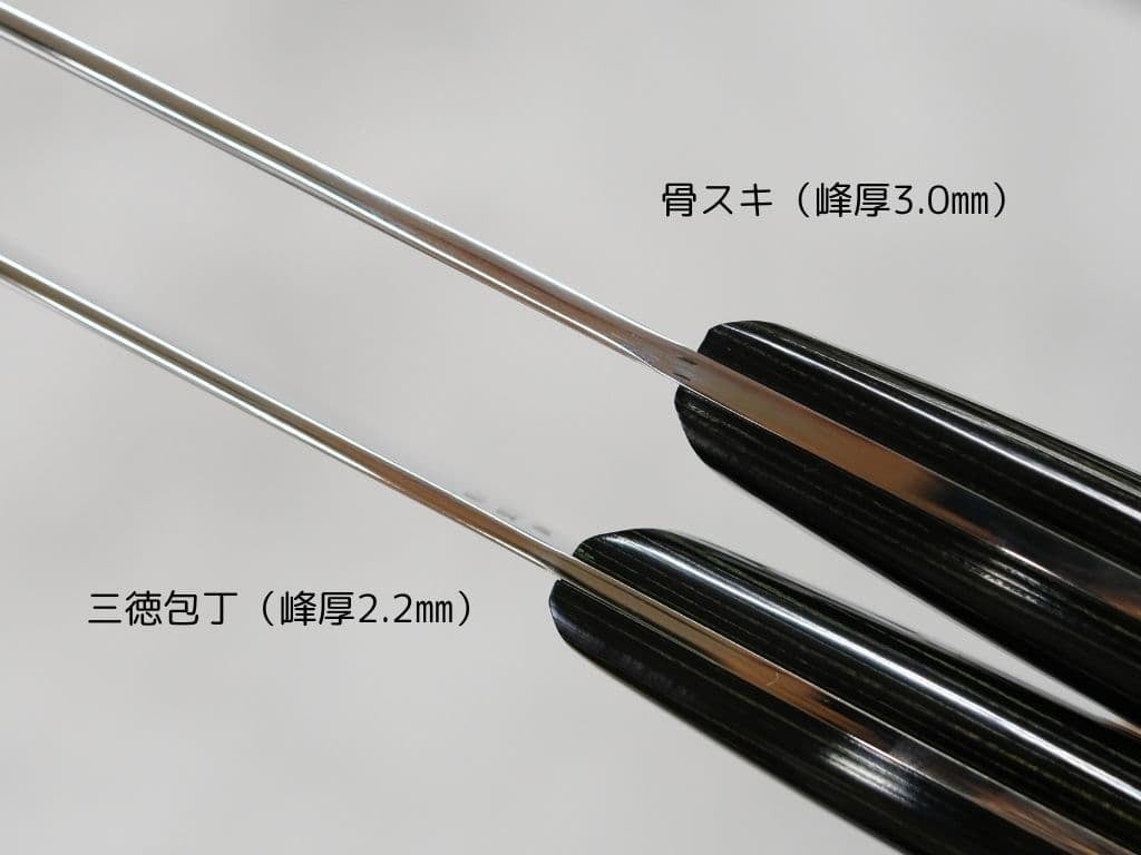 骨スキは刃厚を活かし、主に魚を捌いたり骨付き肉の骨から肉を綺麗に切り剝がしたりするための丈夫な包丁です。峰厚が3.0mmと厚く、硬い食材を切る際に用います。