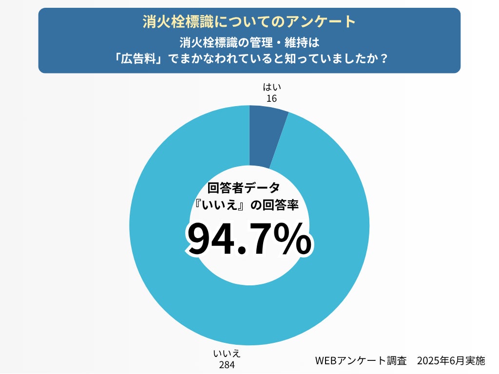 「消火栓標識の管理・維持は広告料でまかなわれていると知っていましたか?」と質問したところ、全体の94.7%が「いいえ」と回答。つまり、消火栓標識の維持管理に企業や個人の広告が活用されている仕組みが、ほとんどの人に認知されていないという実態が明らかになりました。