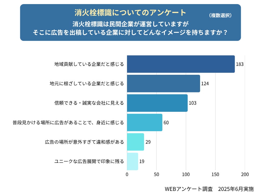 これにより、消火栓標識の広告が防災インフラを支える公共性の高い媒体として、企業の社会的イメージ向上に貢献している様子がうかがえます。