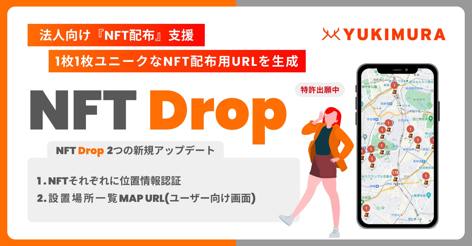 法人向けのNFT配布及びコンサルティング事業を展開する株式会社YUKIMURAは、特許出願中のNFT配布システム『NFT Drop』に2つの新機能を発表しました。位置情報認証によるNFT配布とユーザー向けMAP画面の納品対応を開始しました。今後、特に新しい観光周遊施策として、国内のみならずインバウンド顧客も意識したマーケティングとして活用が期待されます。人流データの分析により観光DXも推進します。