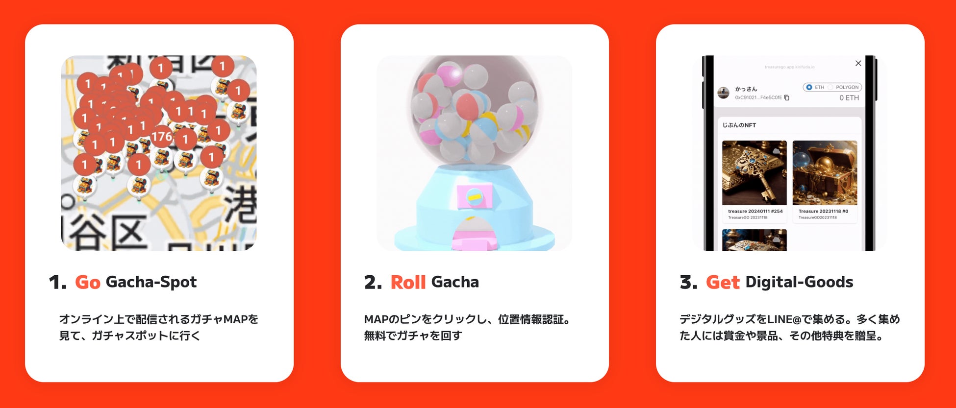 ・NFTをトレジャーと見て、町中を宝探しする体験。宝を一番多く集めたユーザーに賞金などをプレゼント。