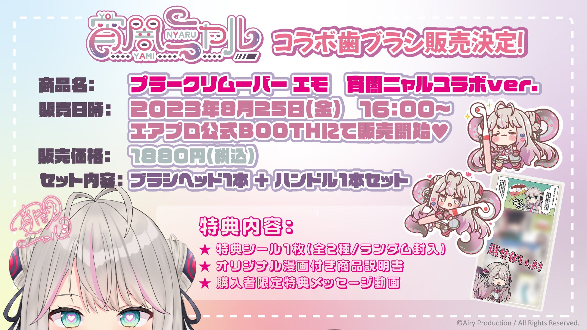 株式会社エアリープロダクション(東京オフィス:東京都港区赤坂)は同社所属Vtuberの「宵闇ニャル」と新世代歯ブラシ「プラークリムーバーEMO」のコラボ商品を発売することが決定しました。