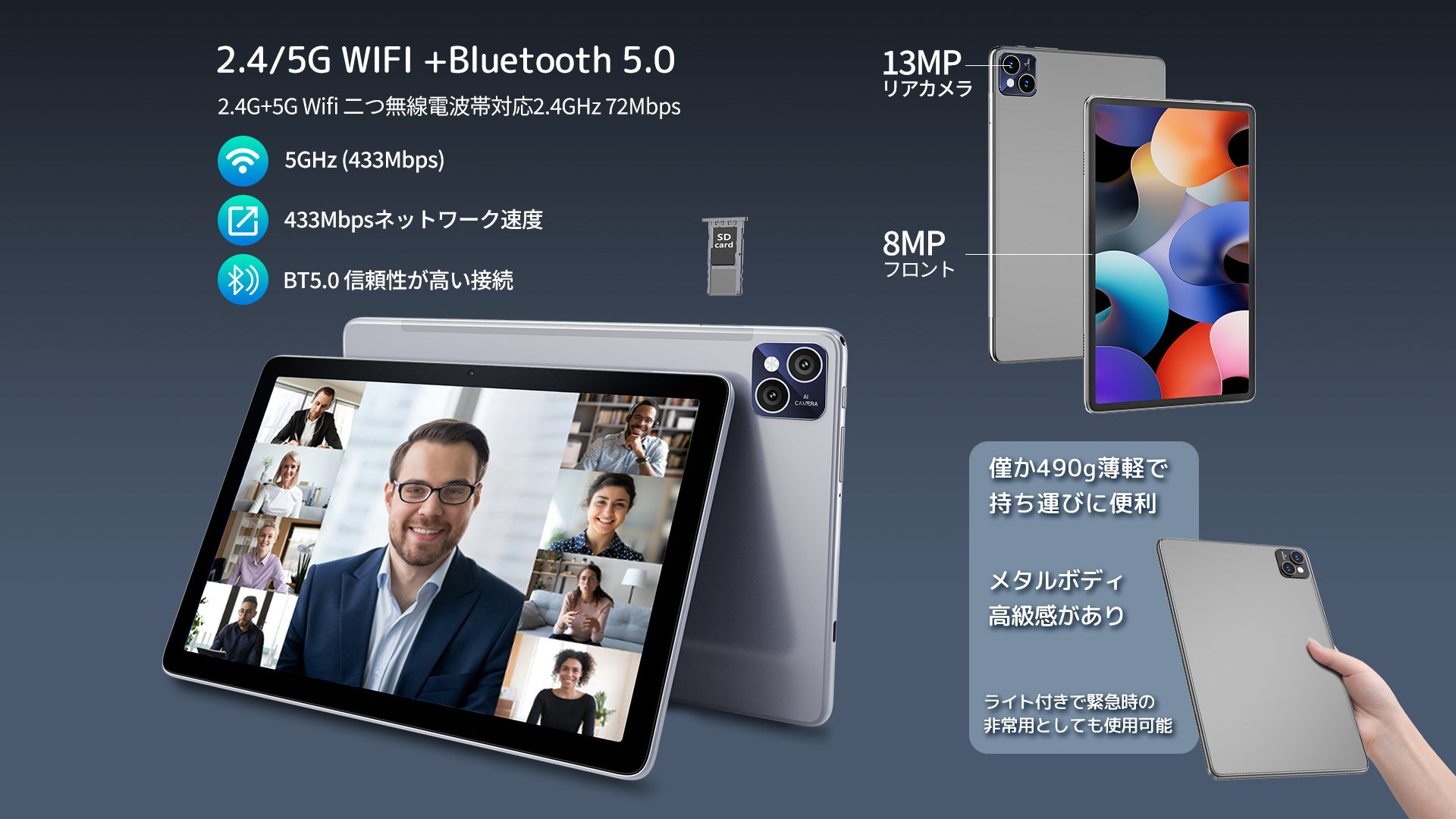 T50タブレット 10インチ wi-fiモデルは802.11 b/g/n/ac高速デュアルバンド WiFi を活用し、5G/2.4G帯域のWiFiネットワークに接続でき、安定した高速通信が可能です。Bluetooth5.0によるワイヤレス通信にも対応しています。顔認識機能があってユーザーの使用における安全性と便利性を大幅に向上させました。