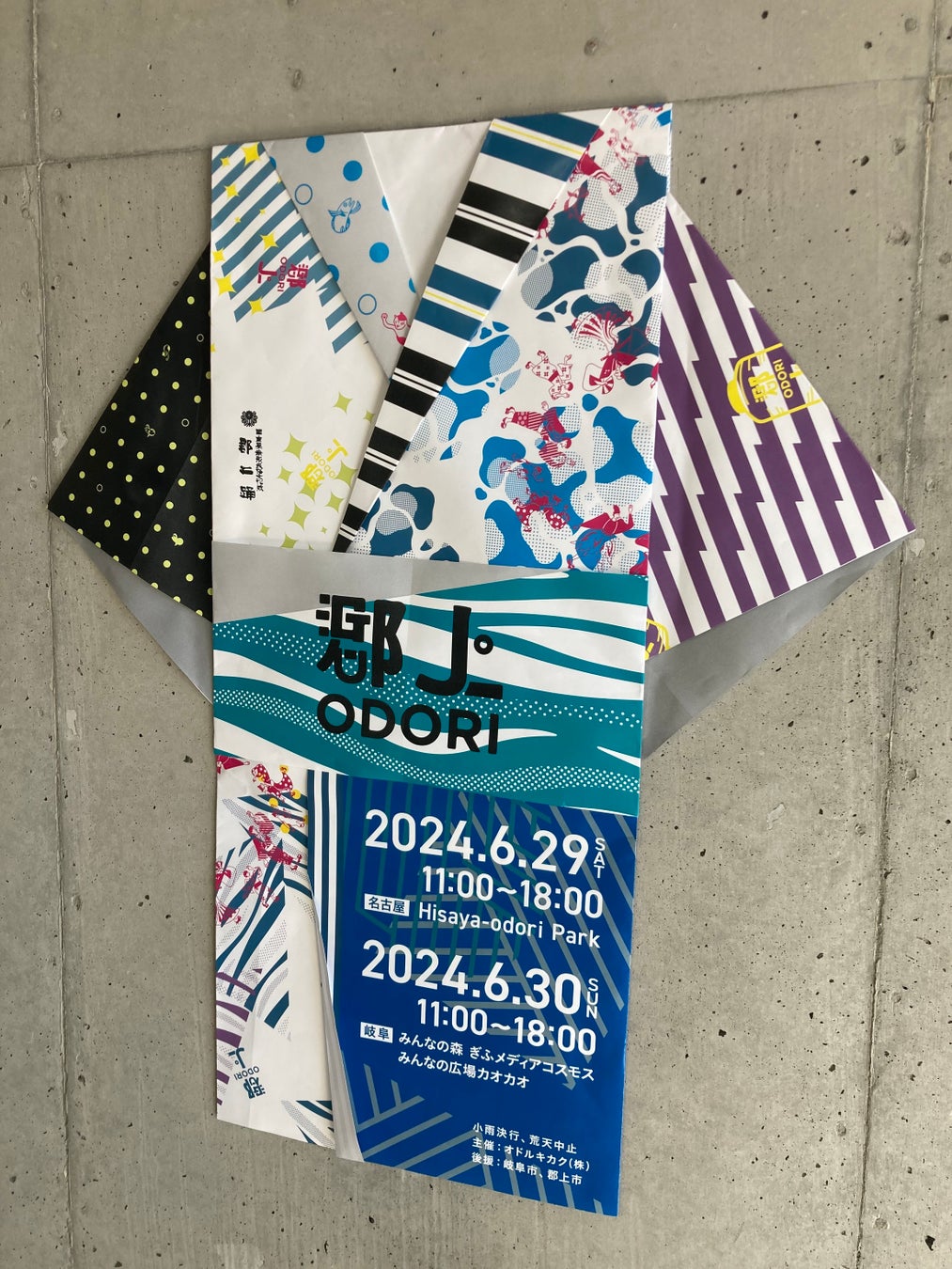 「郡上ODORI」の告知ポスターは、郡上おどりの三種の神器「下駄・手ぬぐい・浴衣」の一つである浴衣をモチーフにした、折り紙のようなユニークなポスターを作成。
